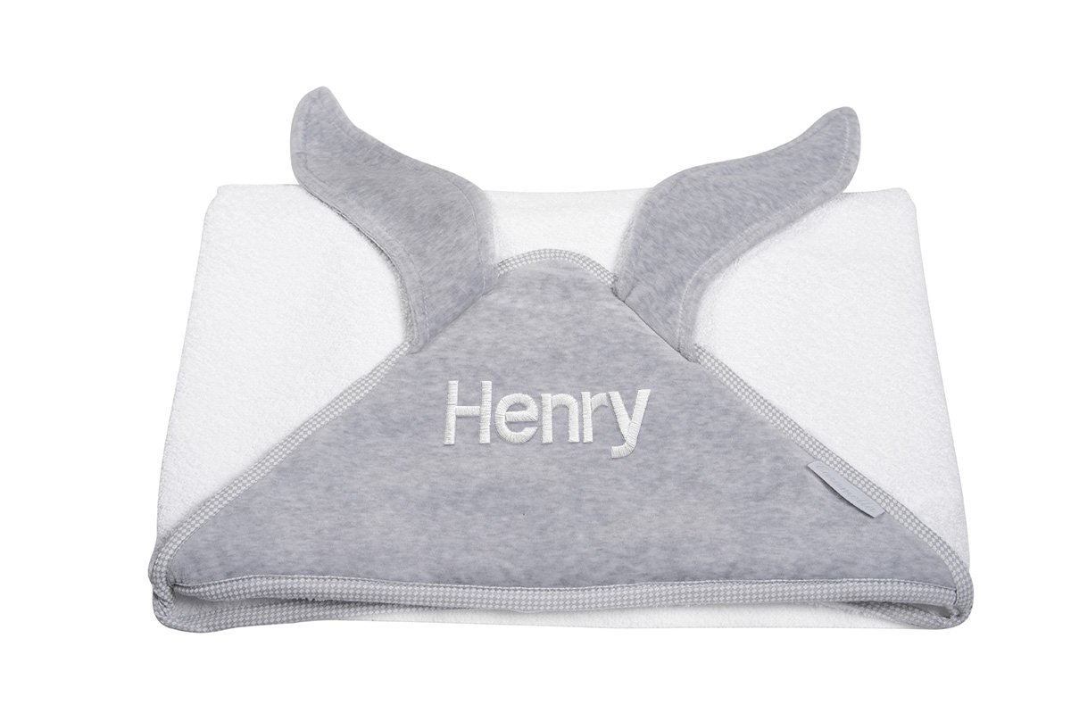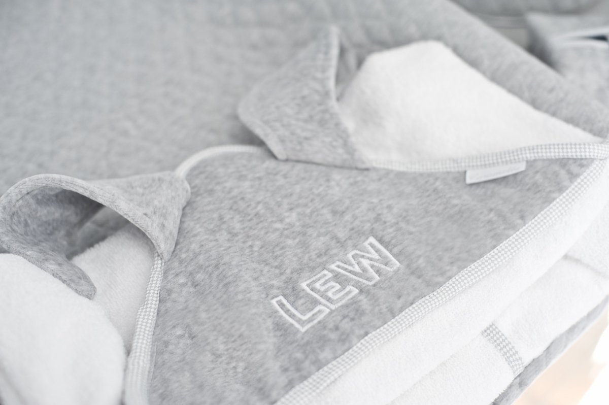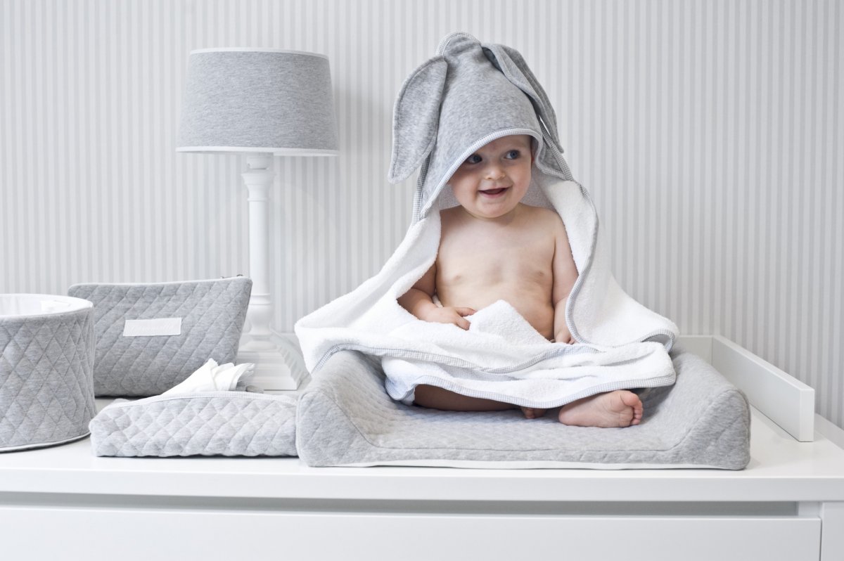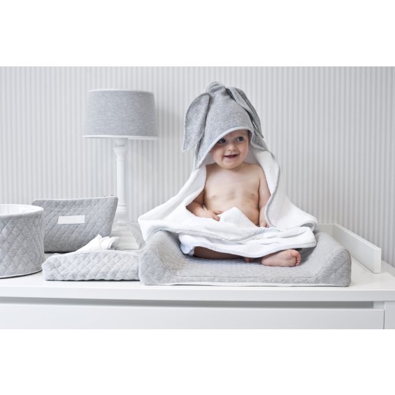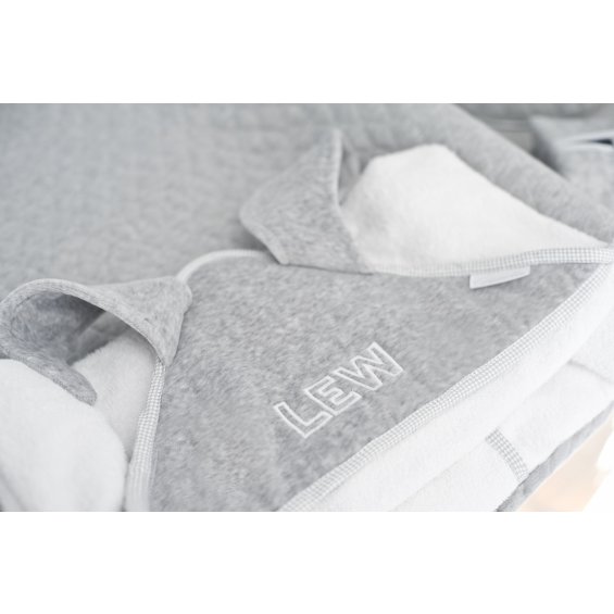 An elegant towel made of white frotte textile and finished with grey cotton textile and adorable bunny ears. Decorated with customized embroidery. The size of the towel is larger than generally available on the market. It can be used by a little baby and an older child. That’s why you will be using it for a very long time.