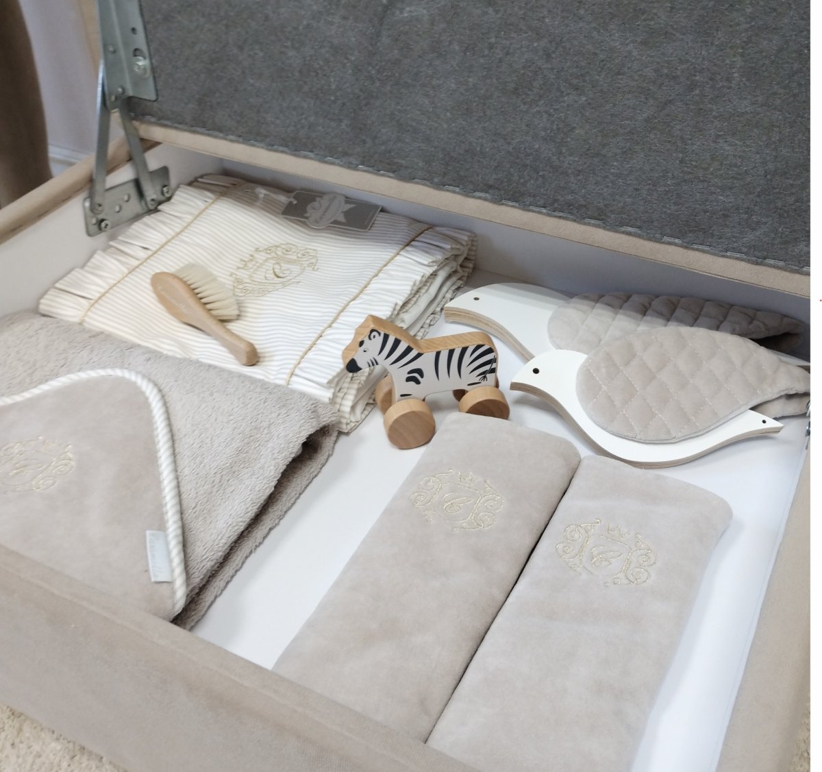 Elegant towel made of beige terry fabric. The beige velour cap is decorated with an elegant golden emblem. The size of the towel is larger than generally available on the market. It can be used by a little baby and an older child. That’s why you will be using it for a very long time.