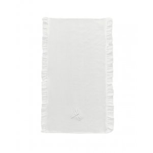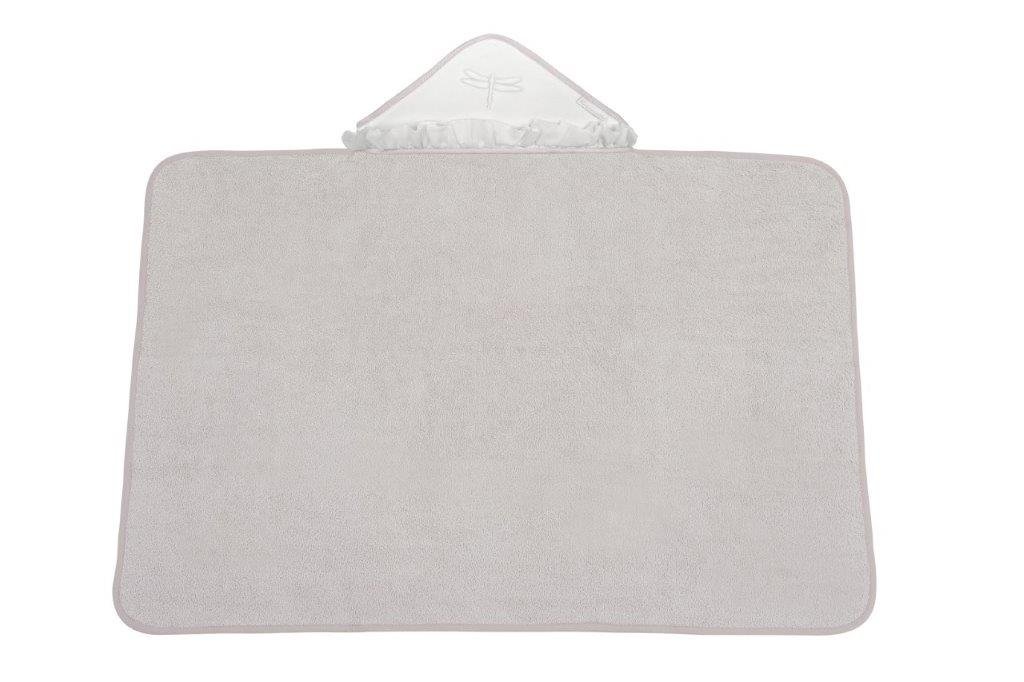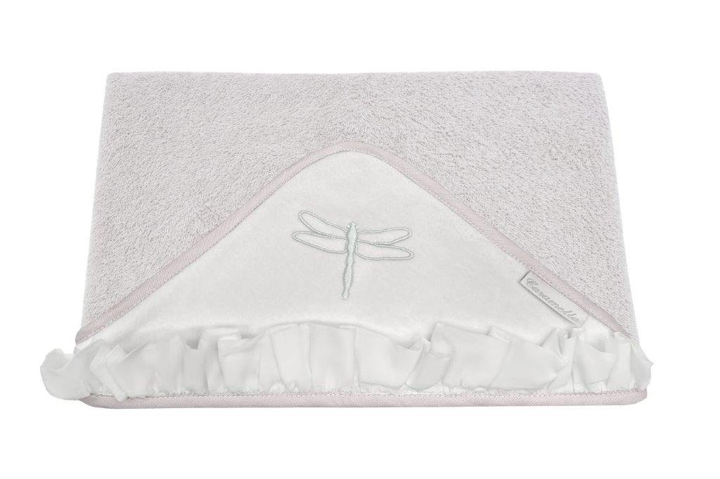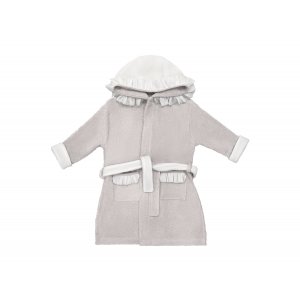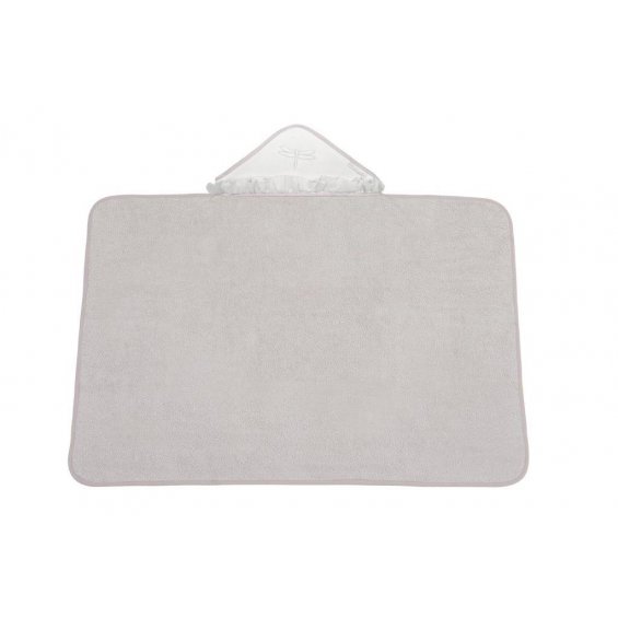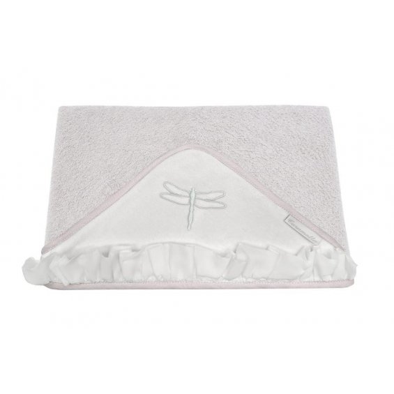 Elegant towel made of beige terry fabric. The cap made of soft ivory velvet is decorated with a transparent voile frill and an embroidery. The size of the towel is larger than generally available on the market. It can be used by a little baby and an older child. That’s why you will be using it for a very long time.