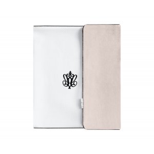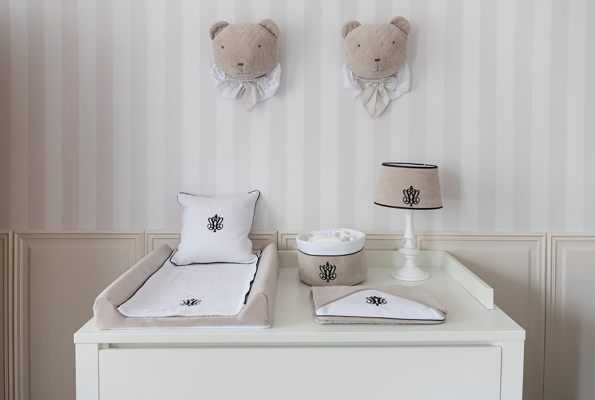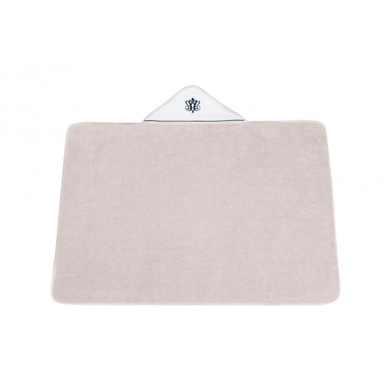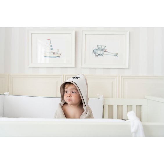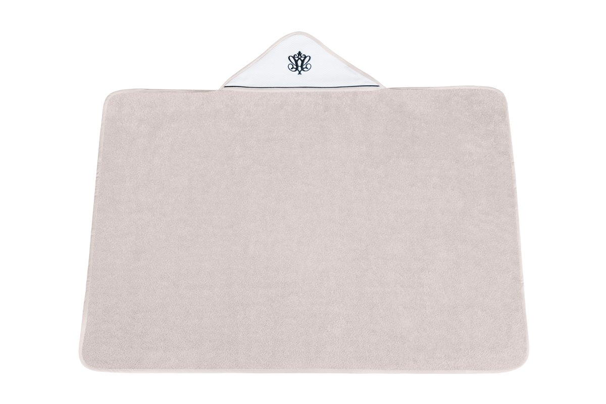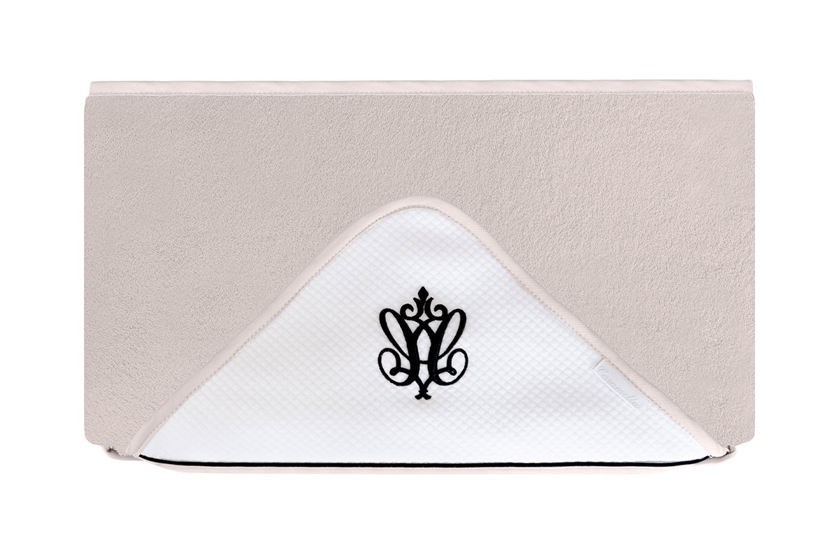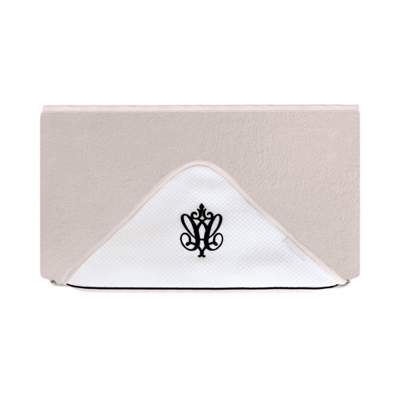 Elegant towel made of beige terry fabric. The white waffle cap is decorated with black embroidery and inset. The size of the towel is larger than generally available on the market. It can be used by a little baby and an older child. That’s why you will be using it for a very long time.