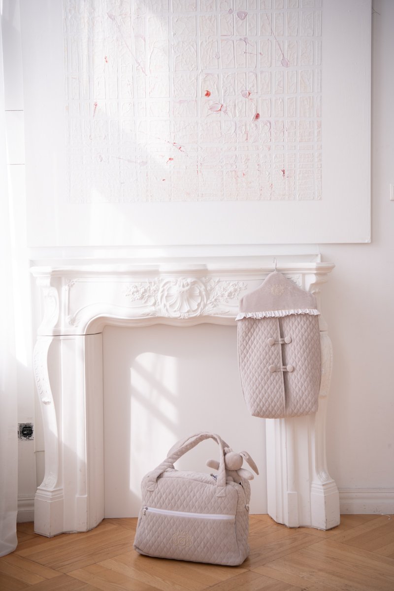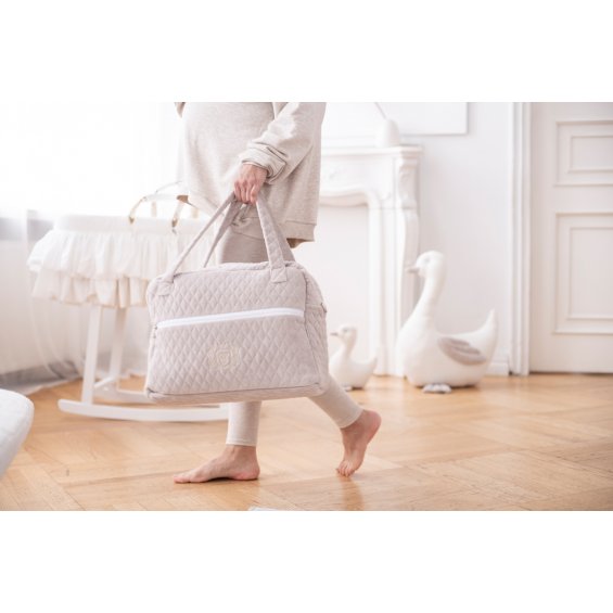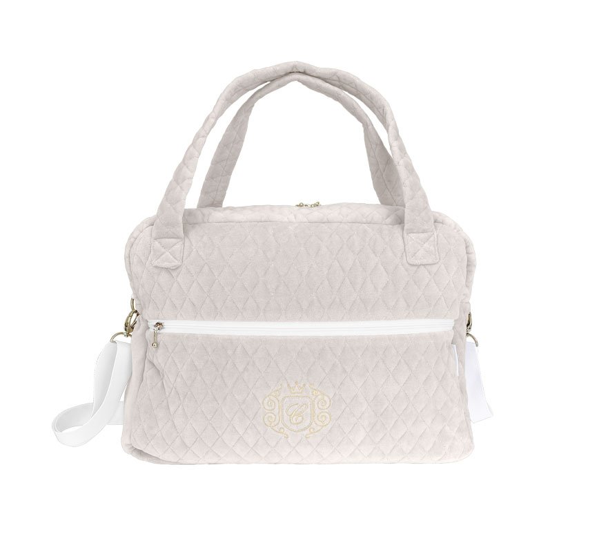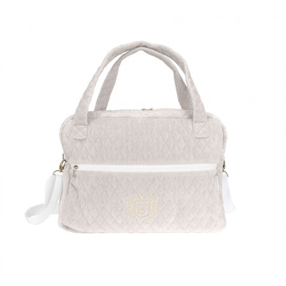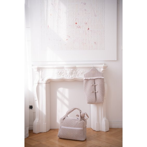 A stylish and very functional bag that will accommodate all baby accessories. Equipped with practical pockets and an additional long adjustable strap, closed with a zipper. Made of beige quilted velour. A must have for every mother.