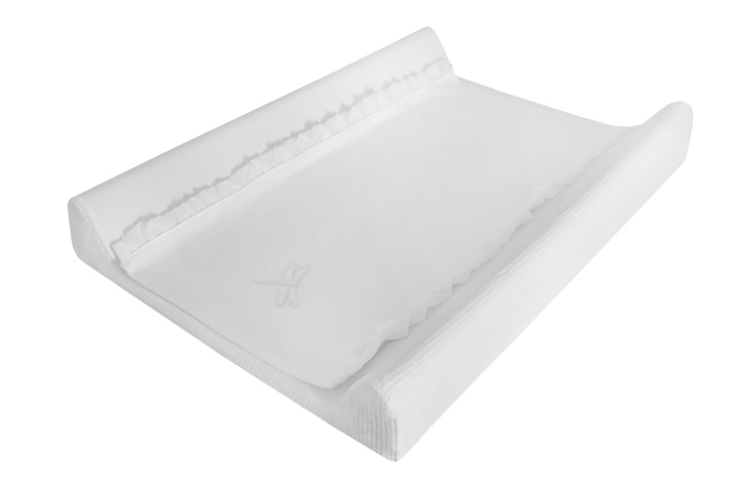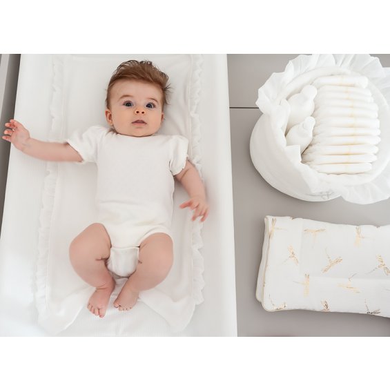 A baby changing station designed for taking care of your child, combines functionality with aesthetics. Elegant velour ivory case with an additional pad decorated with an emblem and a transpatent voile frill. Inside there is an oilcloth insert.