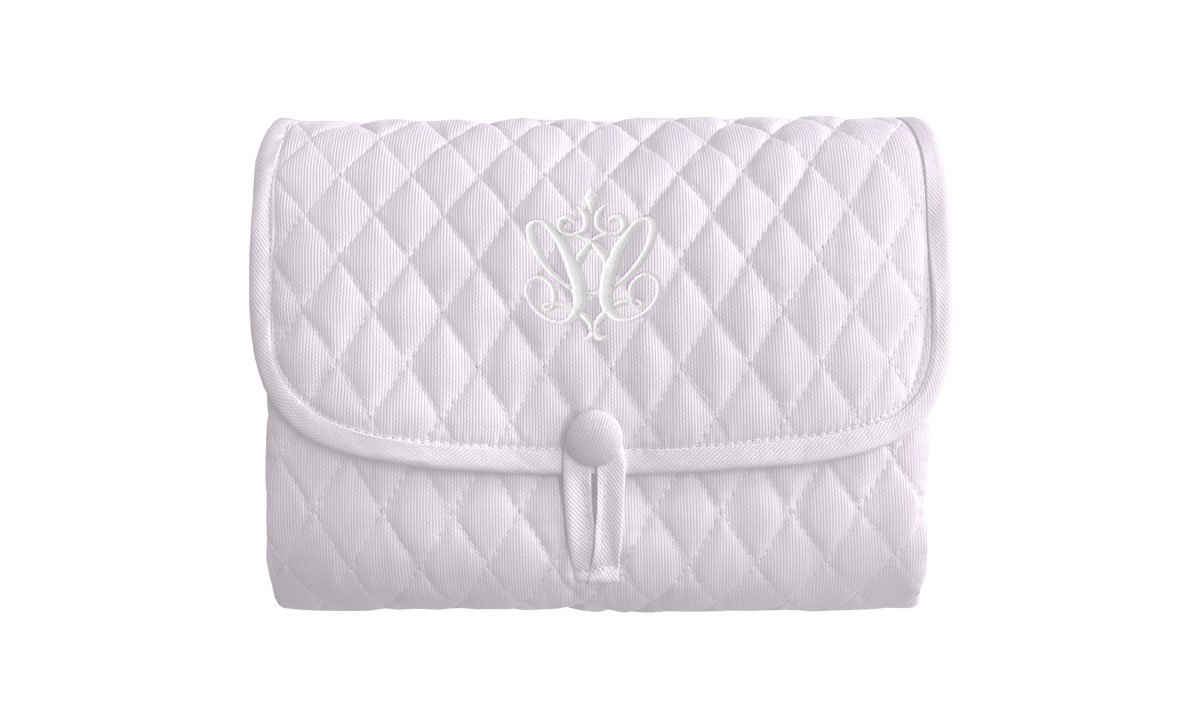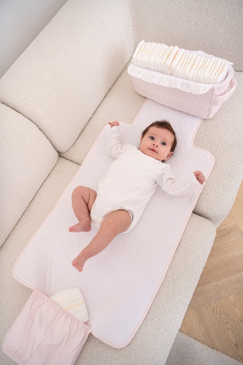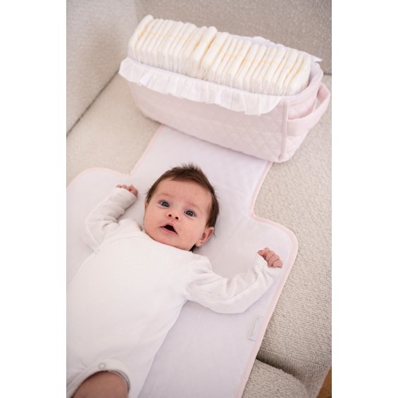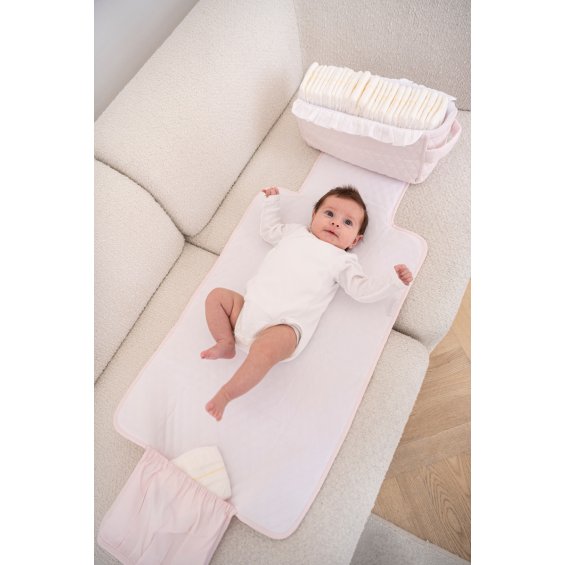 Elegant baby changing mat. Easy to carry and fold. Made of baby pink quilted cotton and lined with velour. Together with the cosmetic bag, it is a perfect complement to the mom bag.