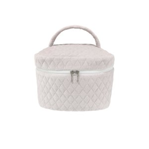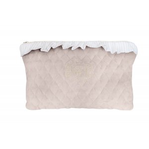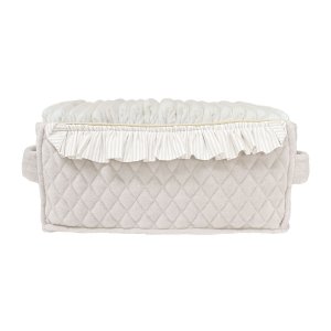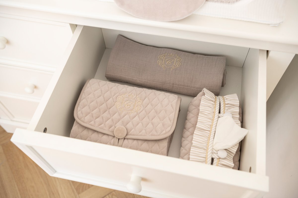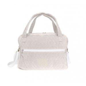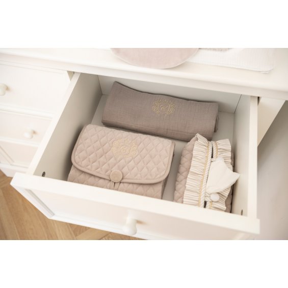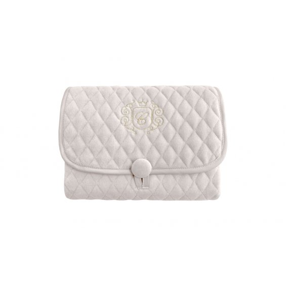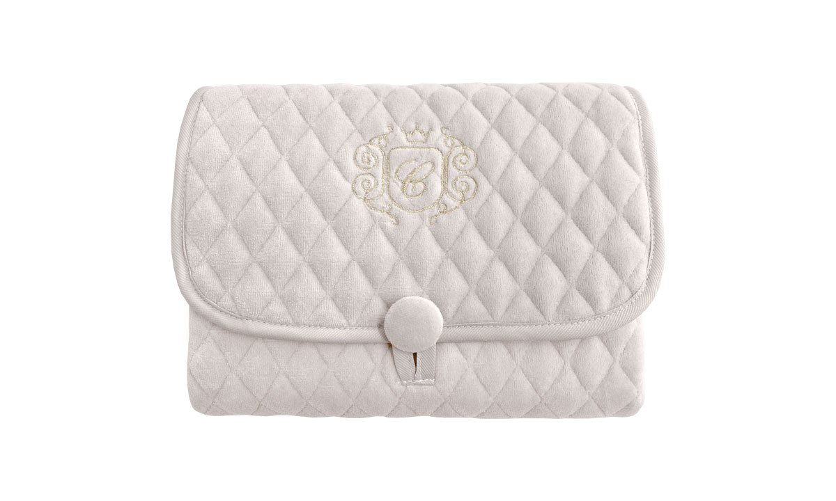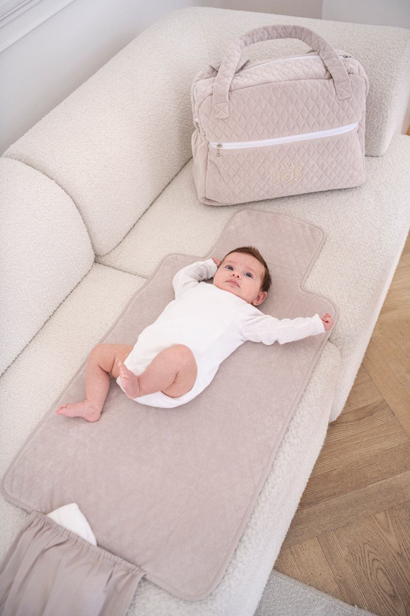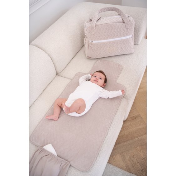 Elegant baby changing mat. Easy to carry and fold. Made of beige quilted velour and lined with velour. Together with the cosmetic bag, it is a perfect complement to the mom bag.