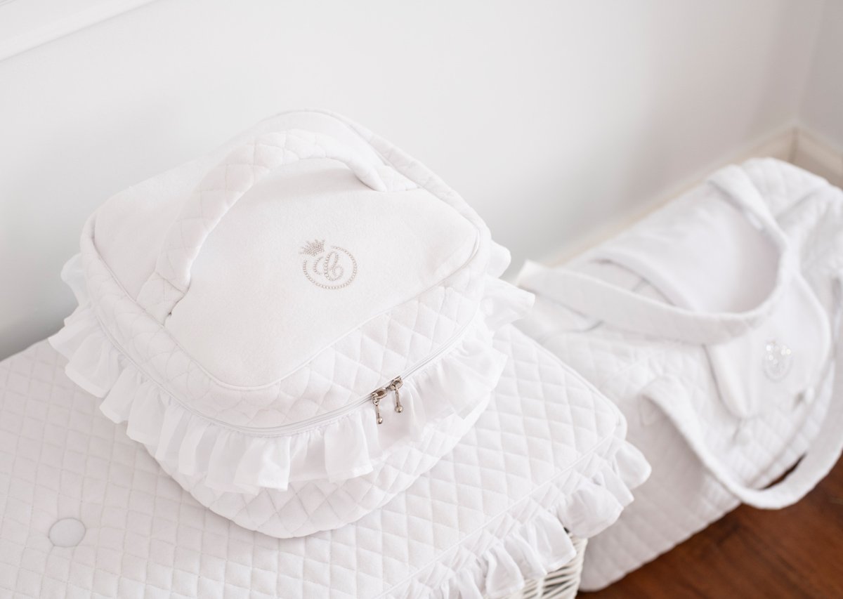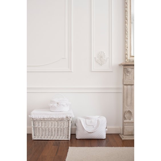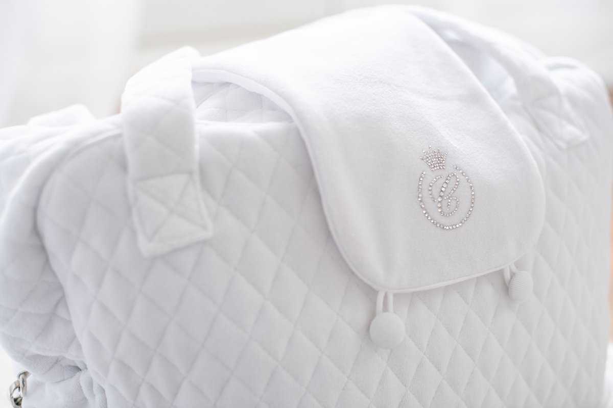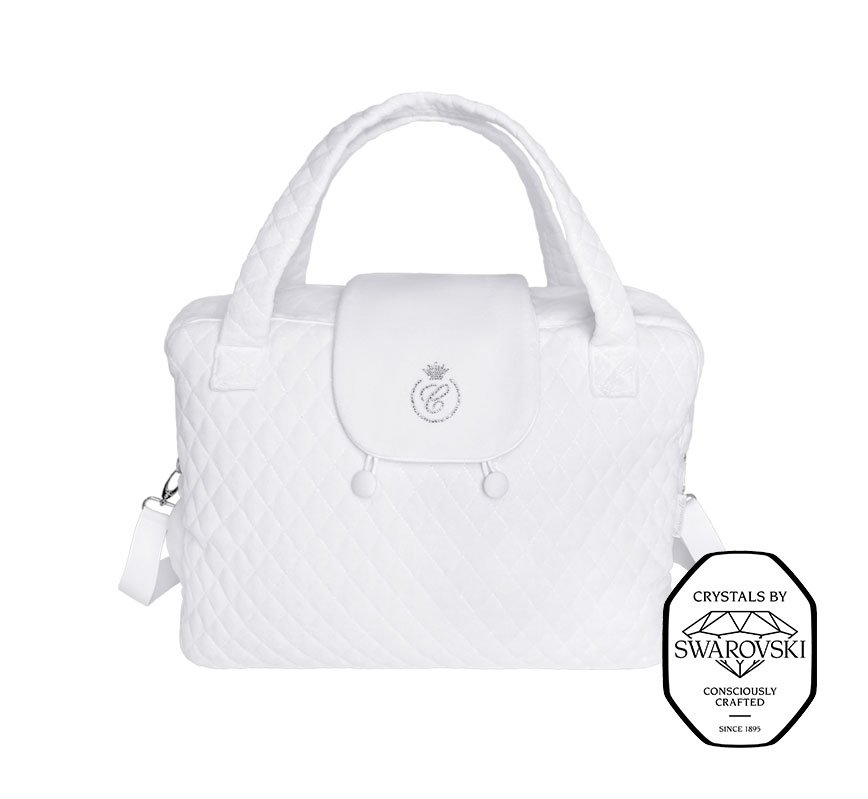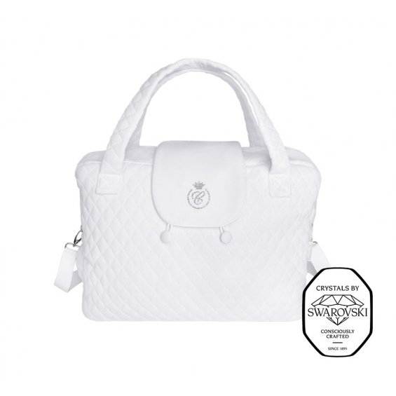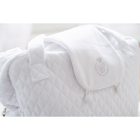 Luxurious bag decorated with Swarovski® crystals. Very functional, it will hold all baby accessories. Equipped with practical pockets and an additional long adjustable strap, closed with a zipper. Made of white quilted velour decorated with an emblem of original Swarovski® crystals. An essential for every mom.