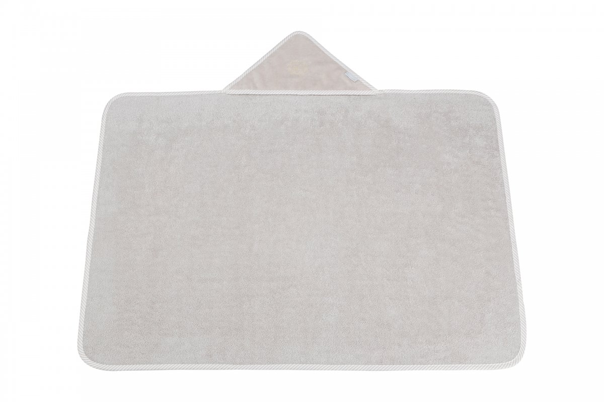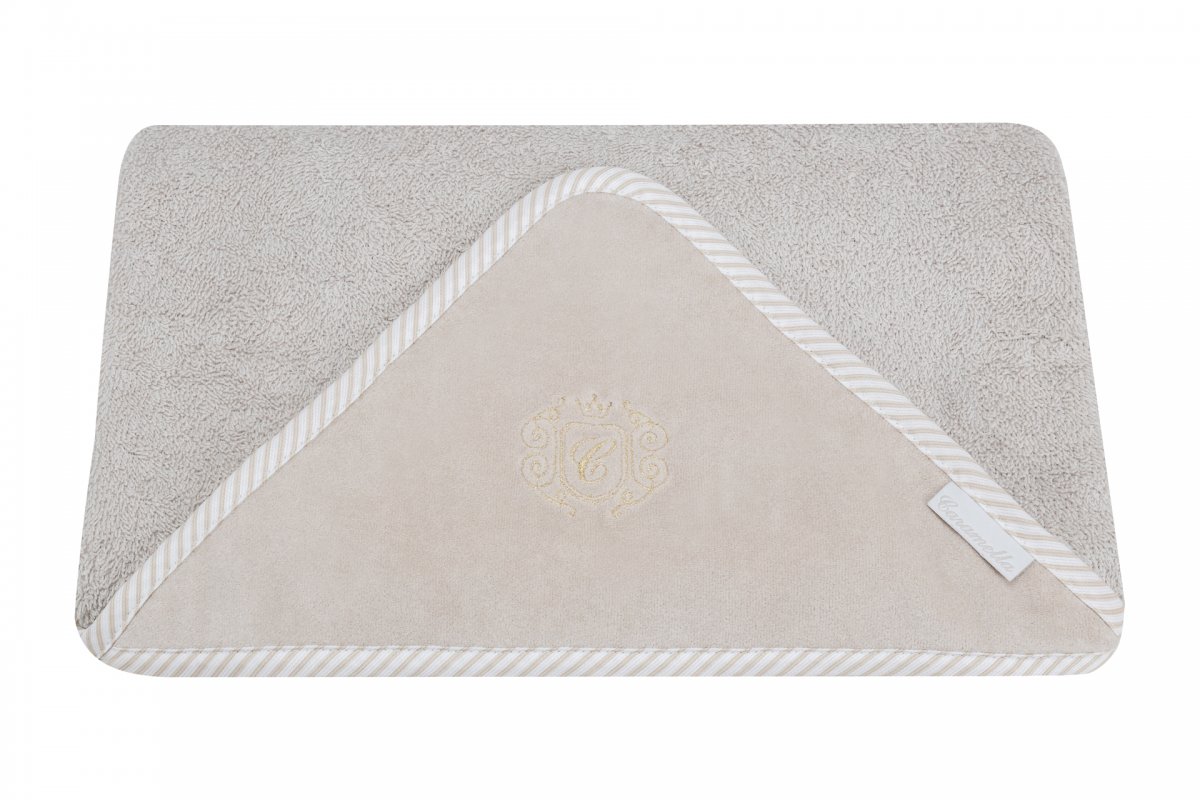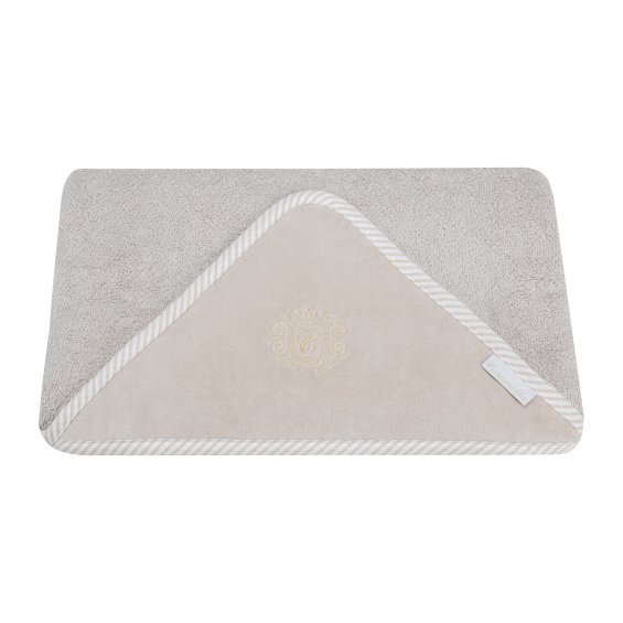 Elegant towel made of beige terry fabric. The beige velour cap is decorated with an elegant golden emblem. The size of the towel is larger than generally available on the market. It can be used by a little baby and an older child. That’s why you will be using it for a very long time.