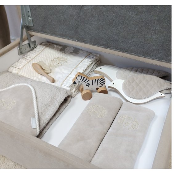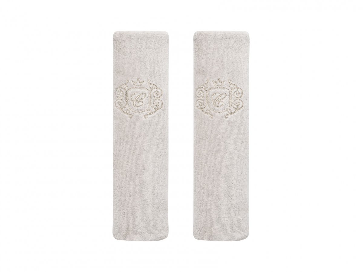 The seat belt pads protect your child against abrasions. They are made of soft beige velour and decorated with an elegant emblem. They perfectly match any type of stroller and car seats.