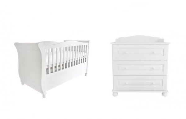 A post-exhibition furniture set from the romantic line, including a baby cot, a chest of drawers with a changing table. The furniture shows slight traces of use, detailed information and photos are available upon request.