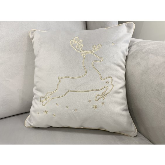 Christmas pillow made of soft grey velor. Decorated with golden embroidery with a reindeer motif, finished with a golden welt. It is a beautiful decoration that will bring a festive mood to the interior.