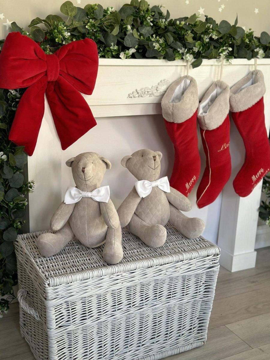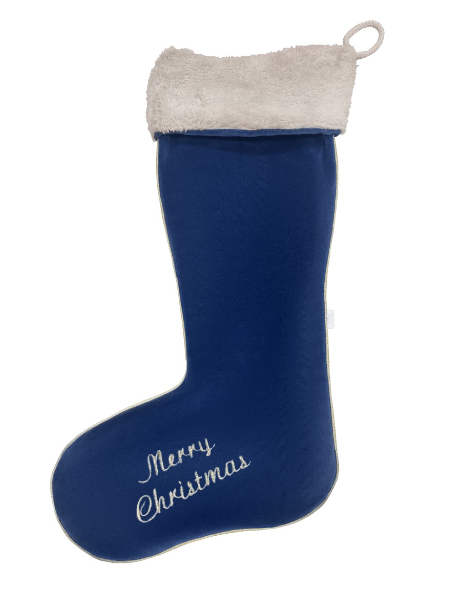 Christmas gifts sock. A beautiful Christmas decoration as well as a great idea for a Christmas gift. The sock is made of navy blue velour, finished with beige plush fur, gold embroidery and inset.