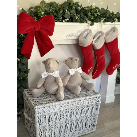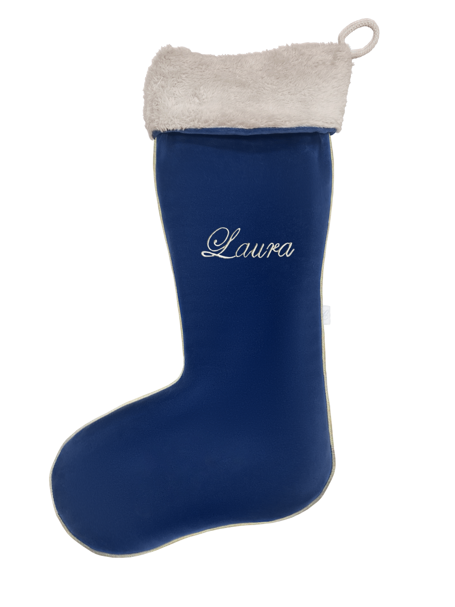 Christmas gifts sock with the possibility of personalization. A beautiful Christmas decoration as well as a great idea for a Christmas gift. The sock is made of navy blue velour, finished with beige plush fur and a golden inset. The price includes personalization (embroidery in gold colour).