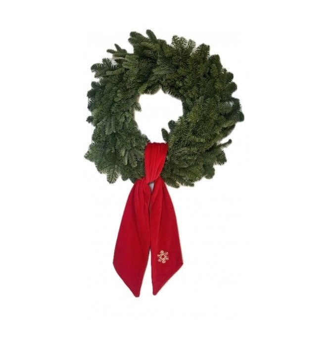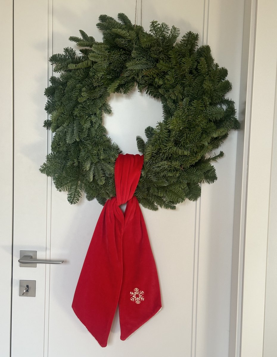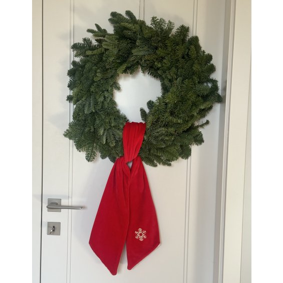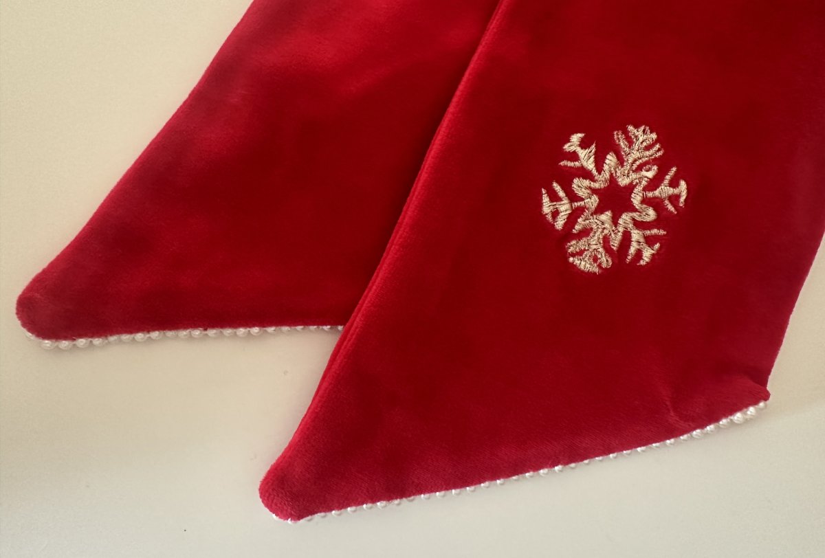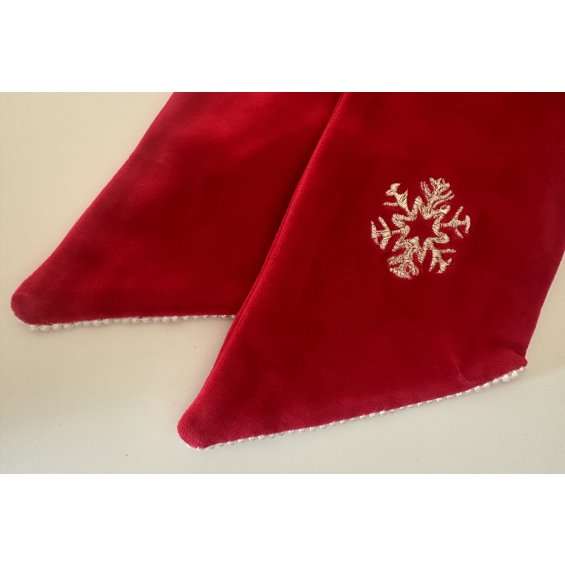 Decorative sash finished with pearls and decorated with Christmas embroidery. Made of red velvet.