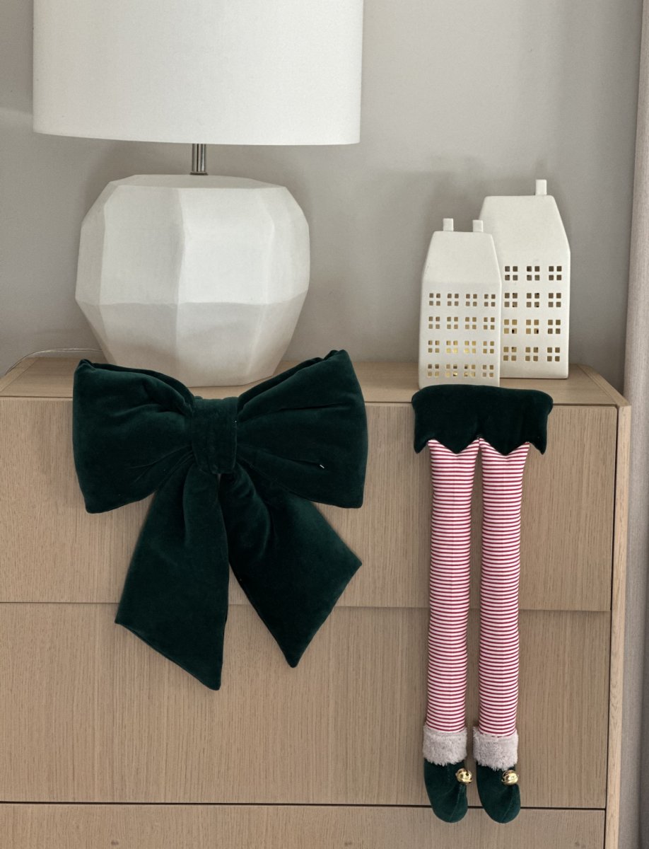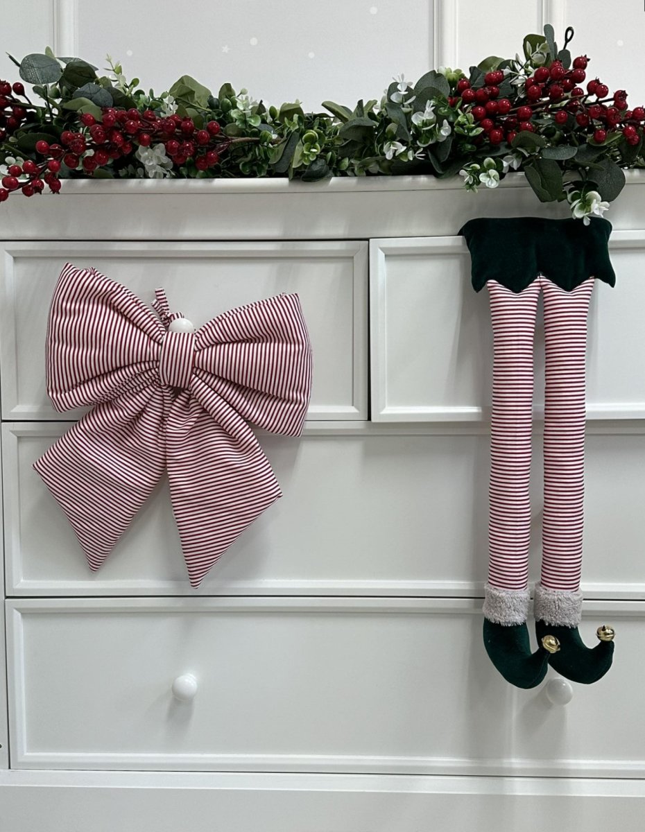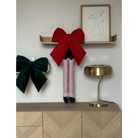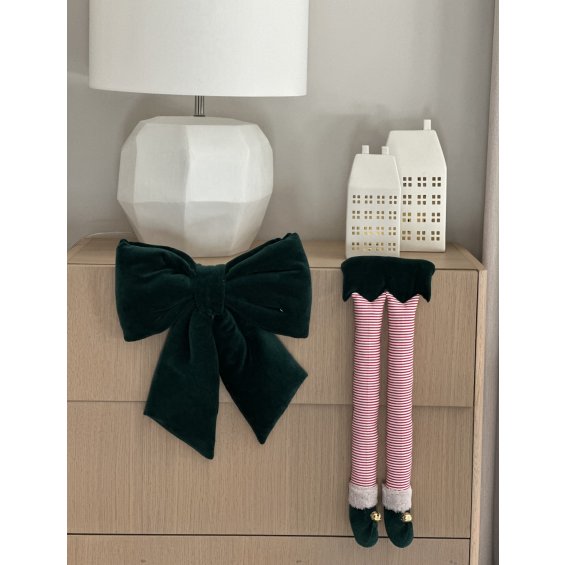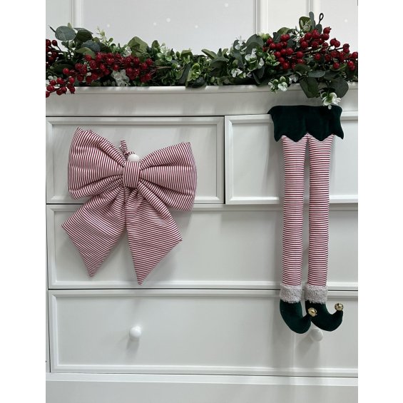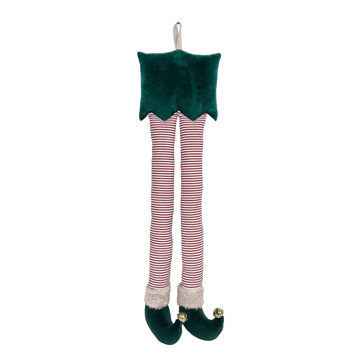 Elf legs - a beautiful Christmas decoration (it has a loop for hanging). Made of green velvet and cotton with red and white stripes, decorated with gold bells.
