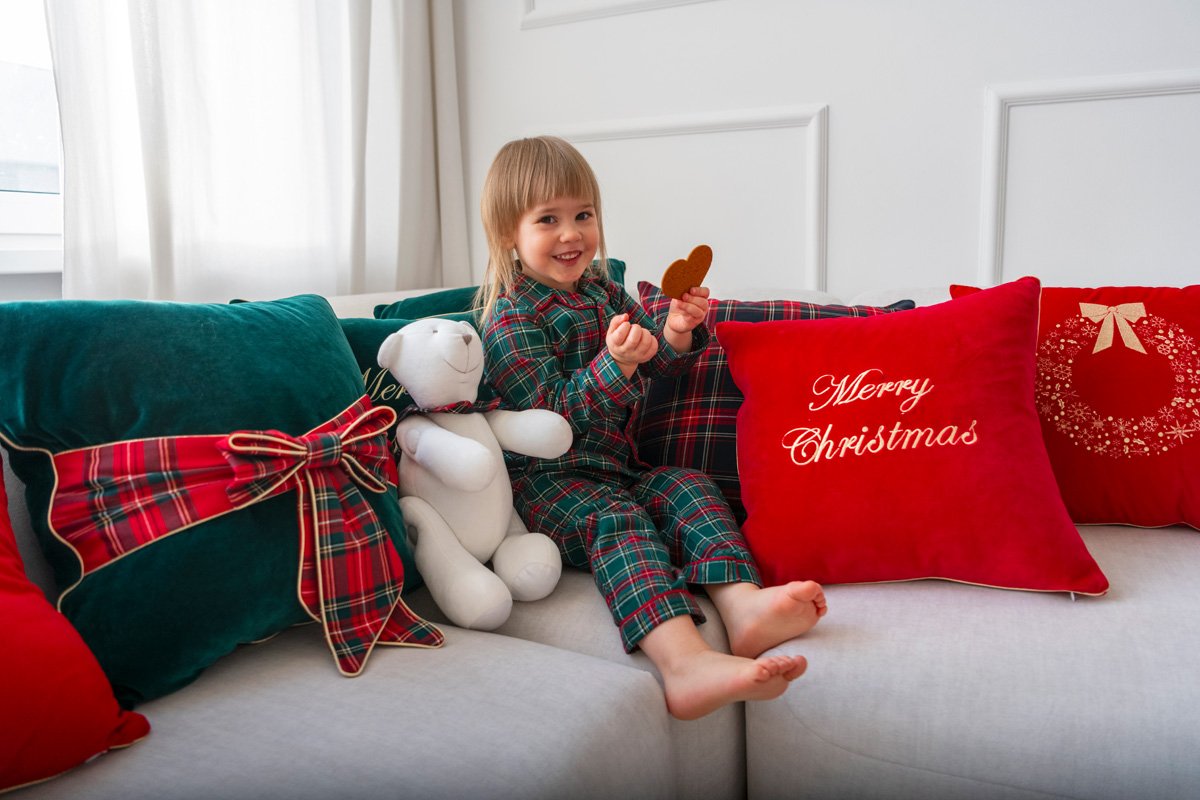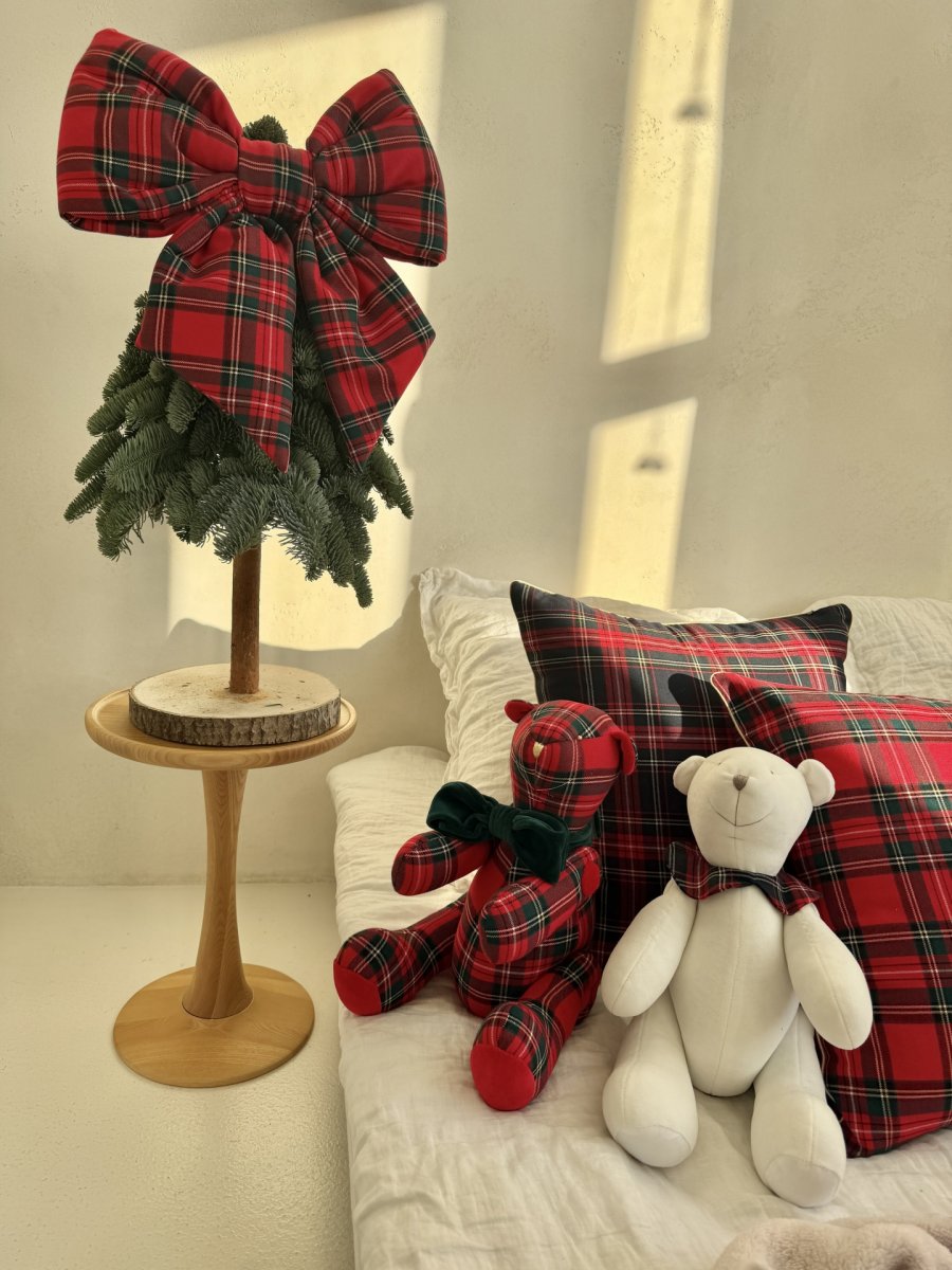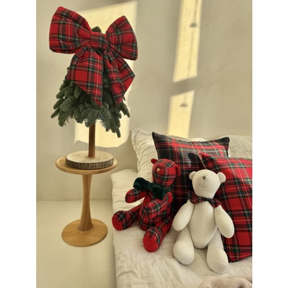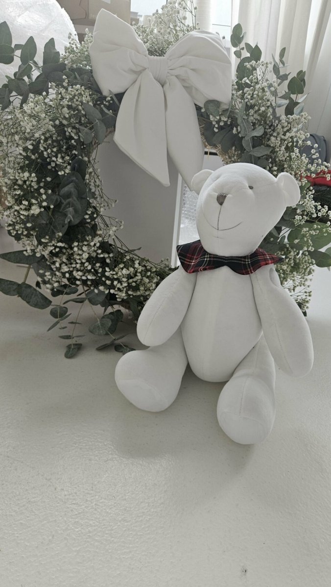A decorative teddy bear in a white shade, made of soft velour fabric. It has a classic, cozy shape, and its main adornment is an elegant collar that adds charm and a traditional character. Perfect as a Christmas or year-round interior decoration, bringing a warm, homely atmosphere.