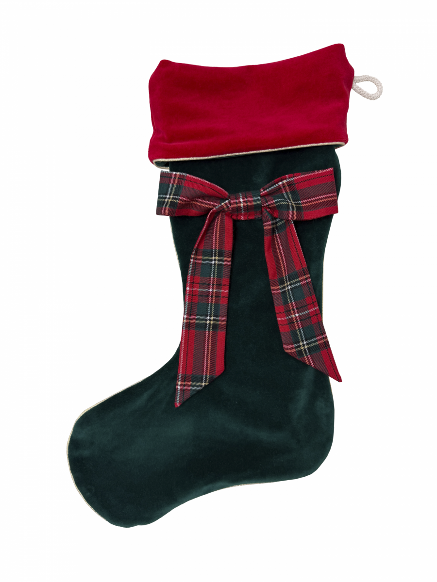 Green Christmas stocking with a plaid bow