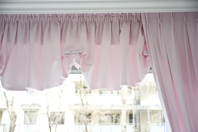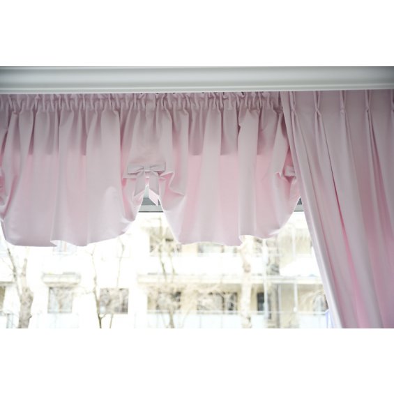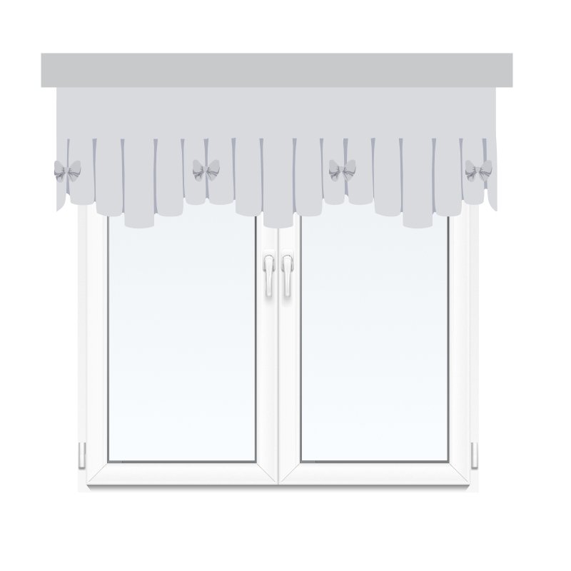 Valance is finished with decorative wave and small bows, crinkled at the top. Valance is a short and static ‘form’ of a roller-blind, it is not equipped with a pull-down mechanism.