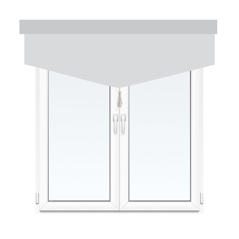 Roman valance with triangular bottom part, finished with white webbing and tassel. Valance is a short and static ‘form’ of a roller-blind, it is not equipped with a pull-down mechanism.