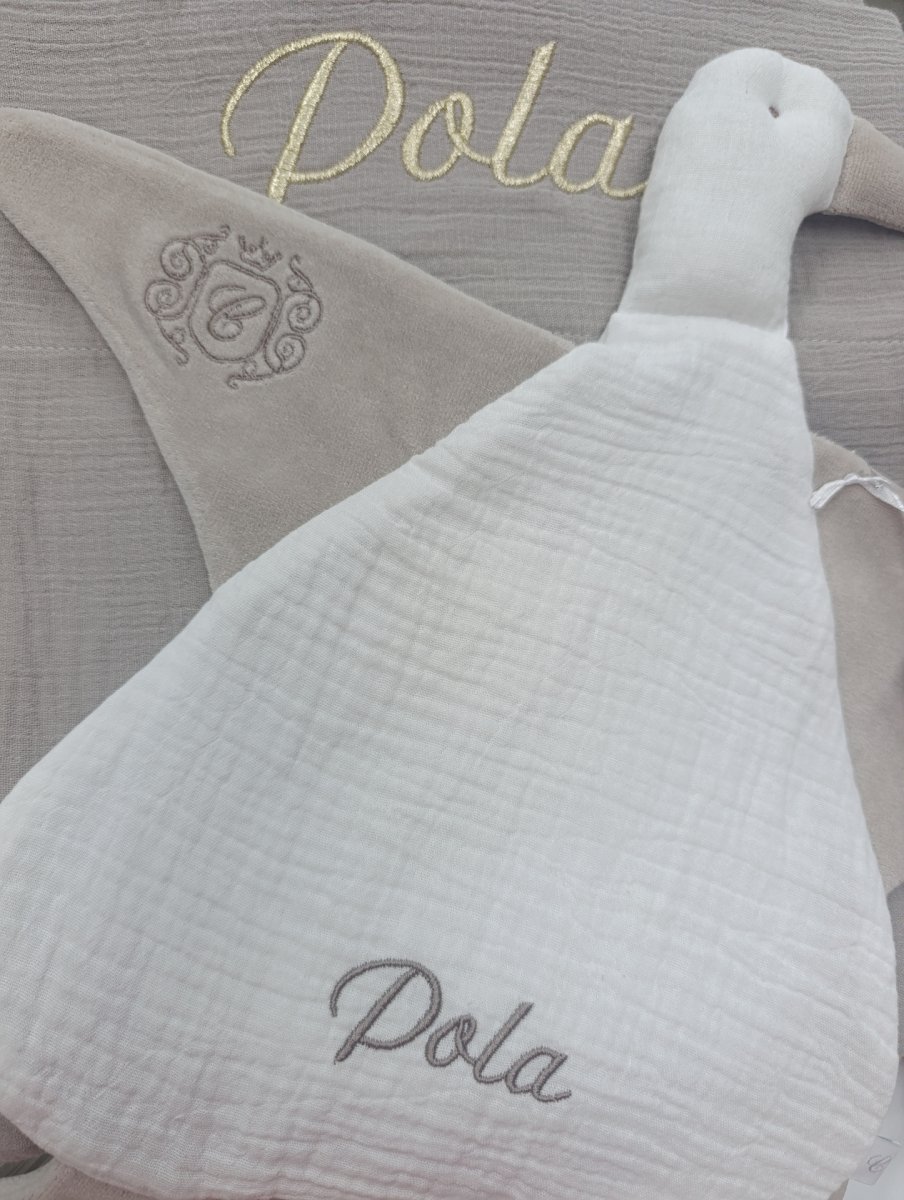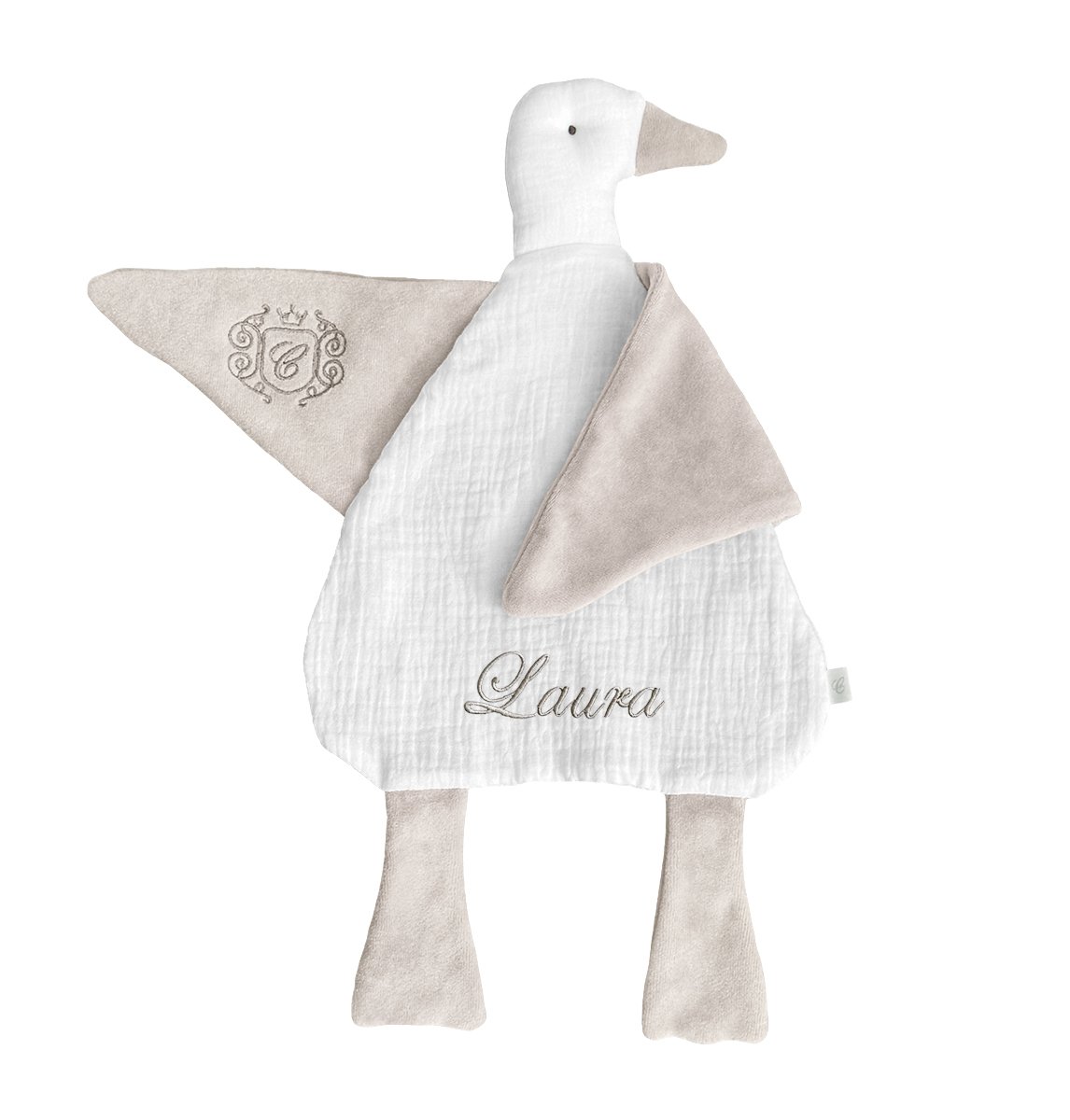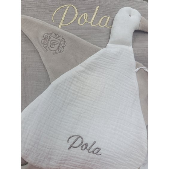 A charming sleeping goose - the baby's first cuddly toy that will help him fall asleep. Dou dou "soaked" with the scent of mum gives the baby a sense of security and closeness. It is possible to personalize bunny by embroidering the name on its tommy.
