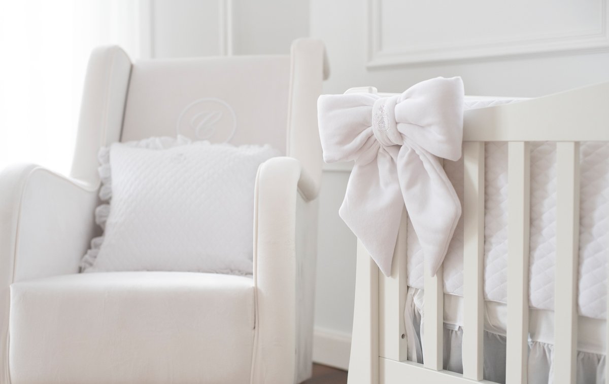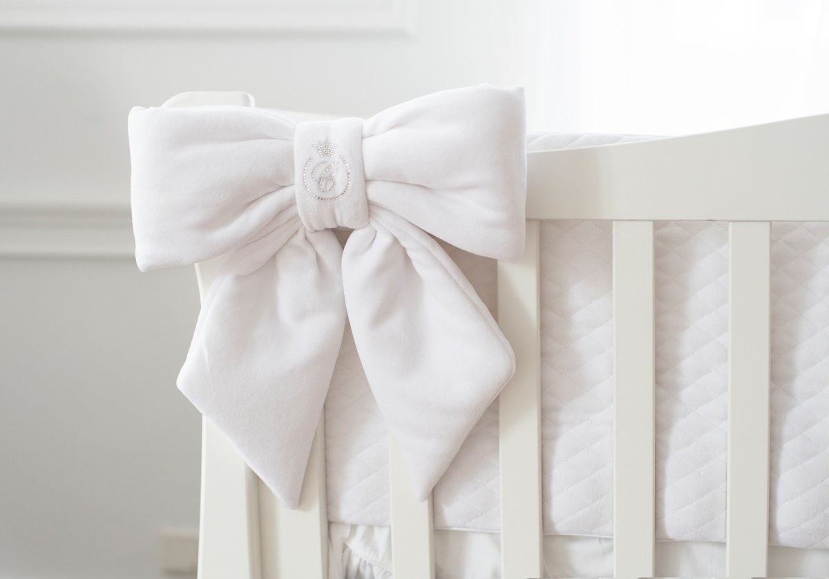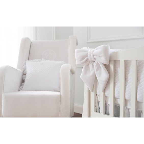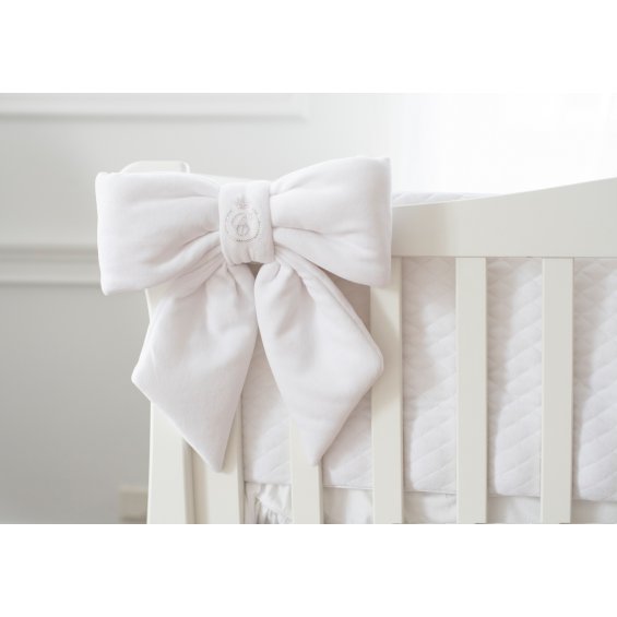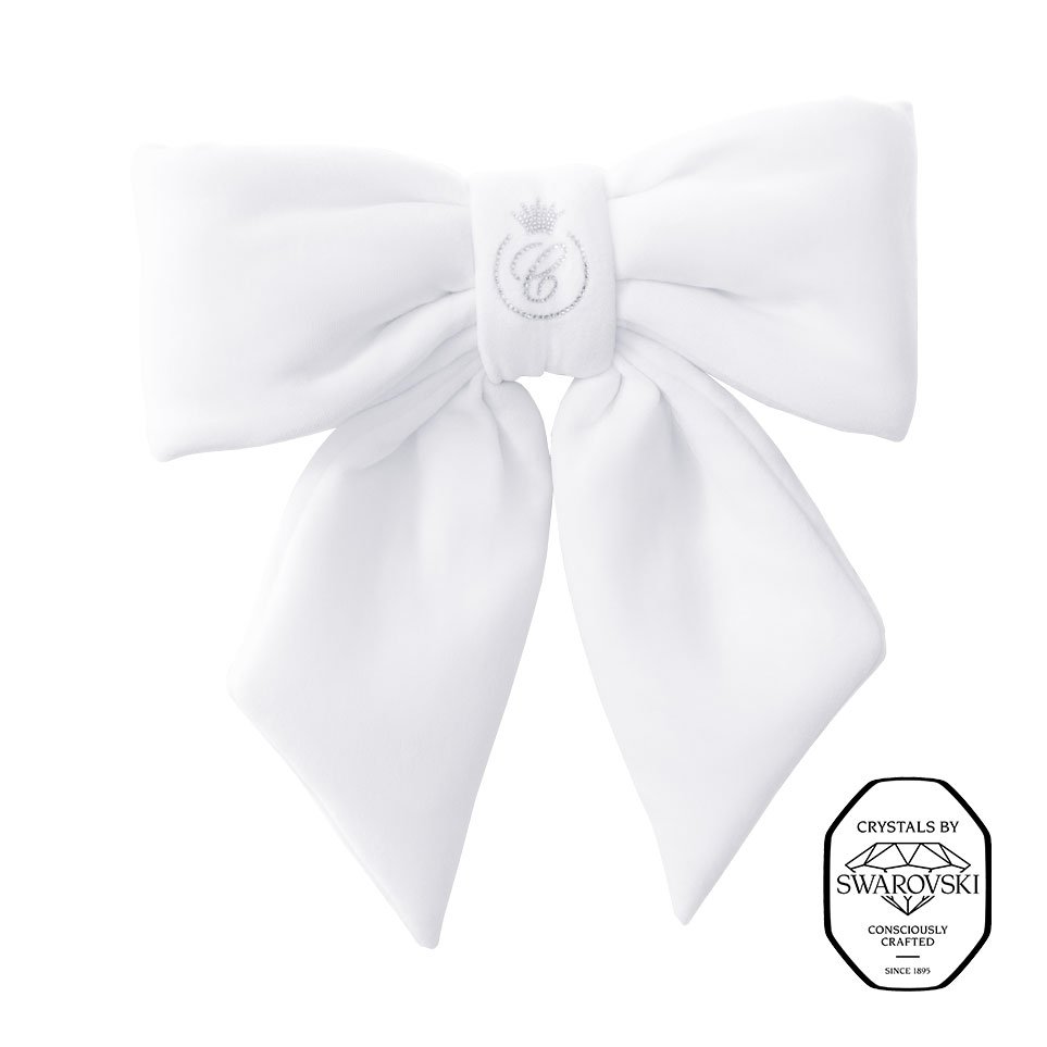 Luxurious decorative bow in XL size decorated with Swarovski® crystals. Made of velour in white color. Thanks to the stiffening, the bow always keeps the perfect shape. Practical straps allow for easy attachment.