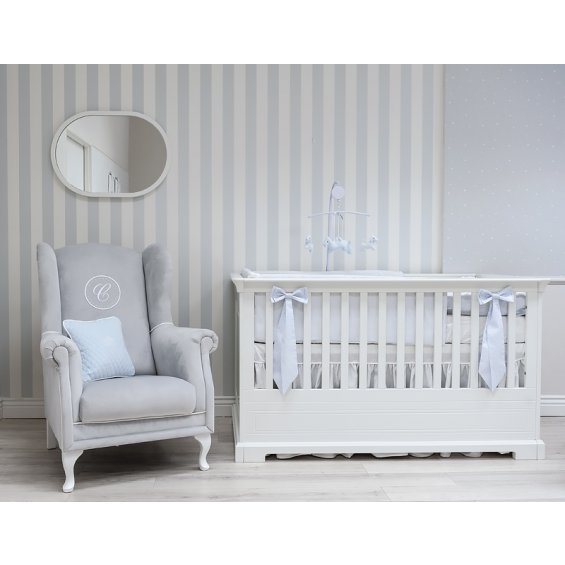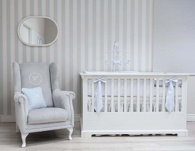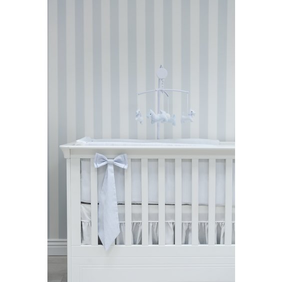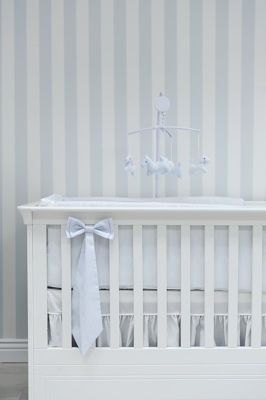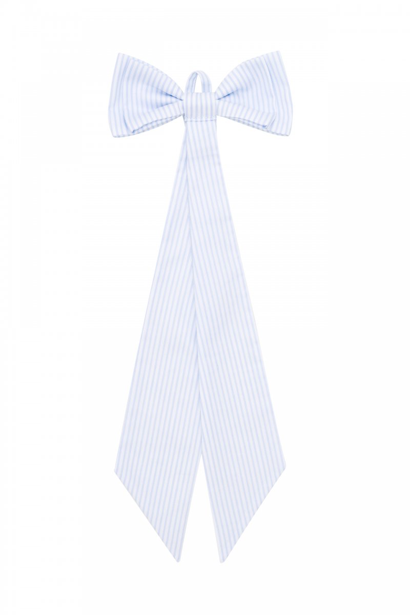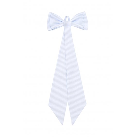 A beautiful decorative baby blue bow. It may be a wall decoration on its own, or it can be attached to a baby's crib, pictures, photo frame etc. It is made of blue textile with little stripes. It has a loop for hanging and strings for attaching.