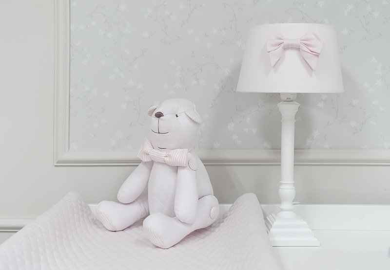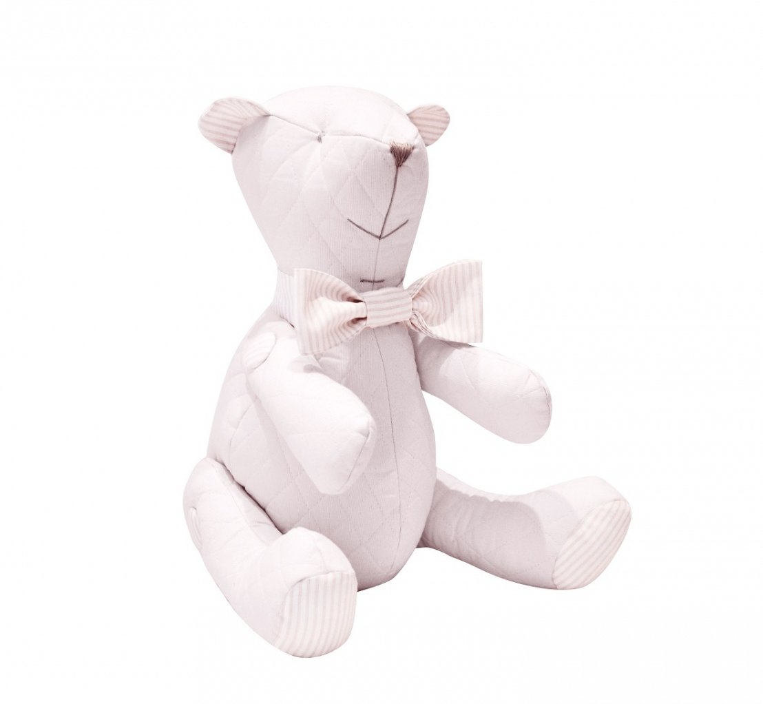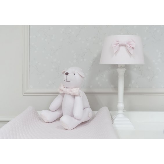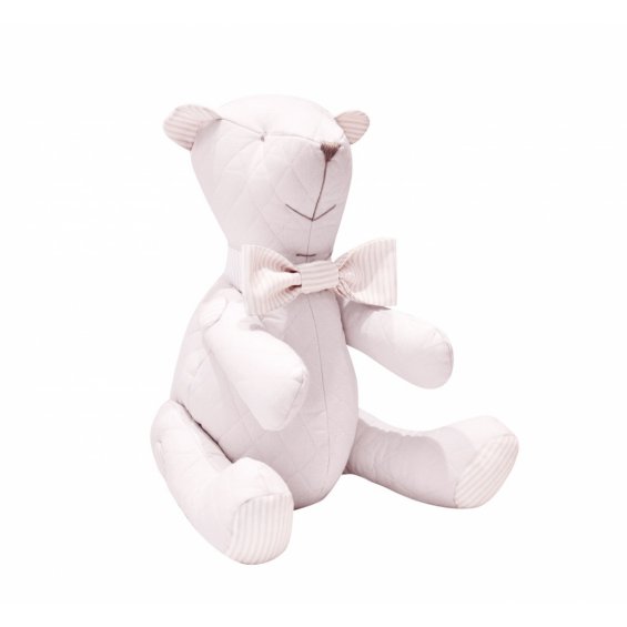 Our teddy bear is unique - looks as if it was taken from a grandmother’s box found in the attic. This teddy bear is handmade, finished with massive buttons, with movable legs and arms. Our teddy bear is made of high-quality quilted powder pink textile and decorated with a stripy bow.