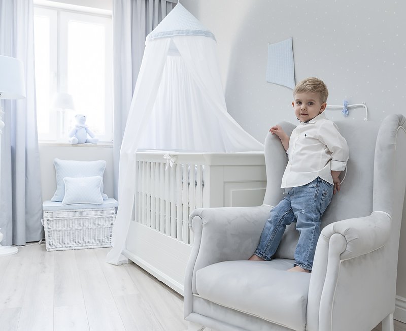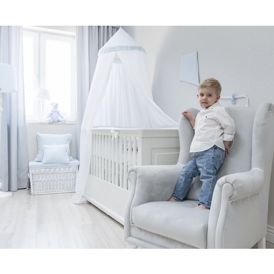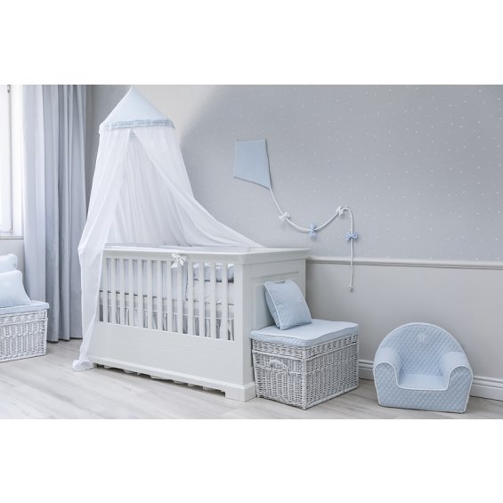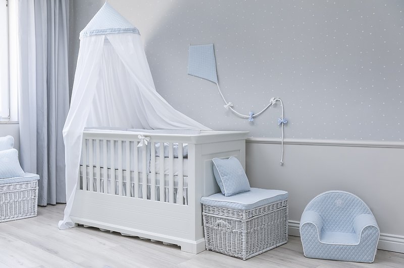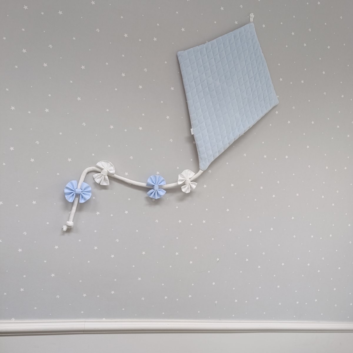 A beautiful handmade kite made of high-quality beige guilted velour. Its twine is deocrated with adorable bows in blue and white. The kite is an original decoration in a baby room.