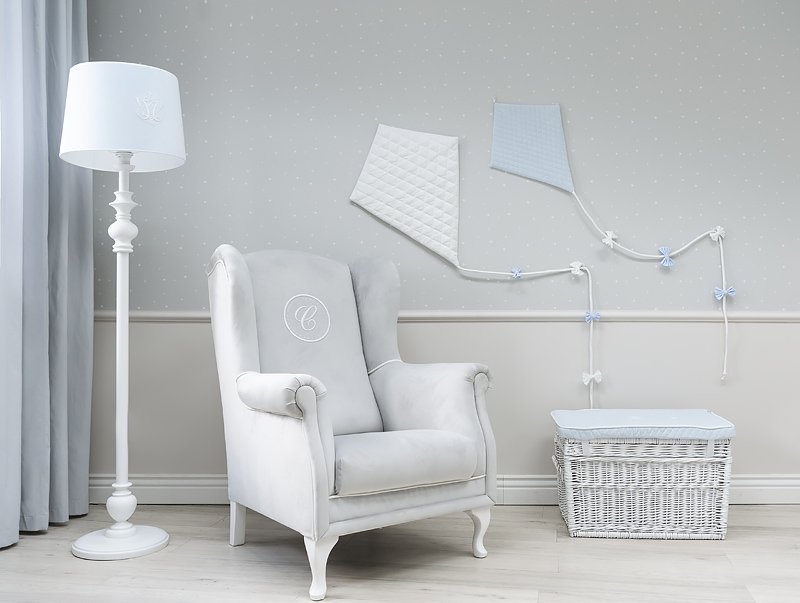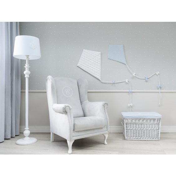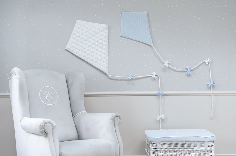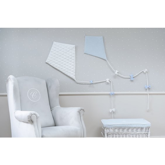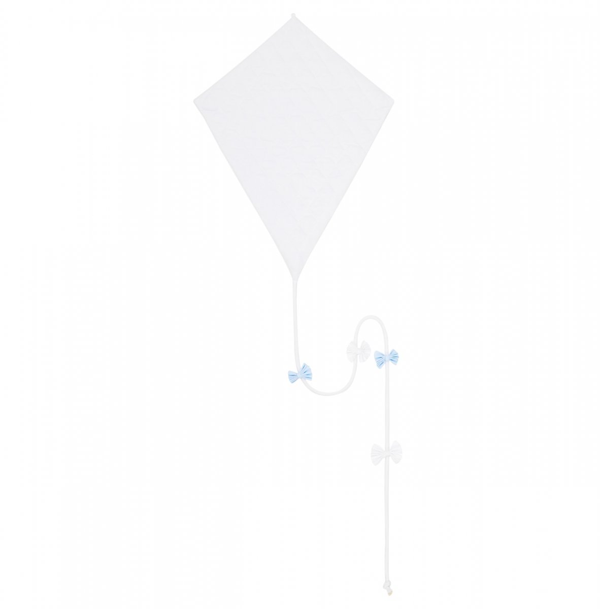 A beautiful handmade kite made of high-quality white guilted textile. Its twine is deocrated with adorable bows in blue and white. The kite is an original decoration in a baby room.