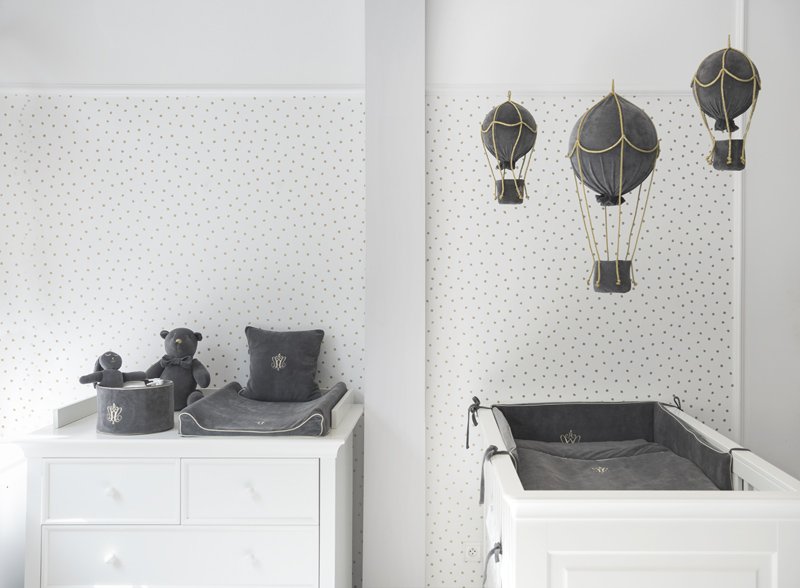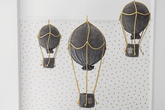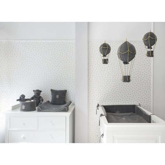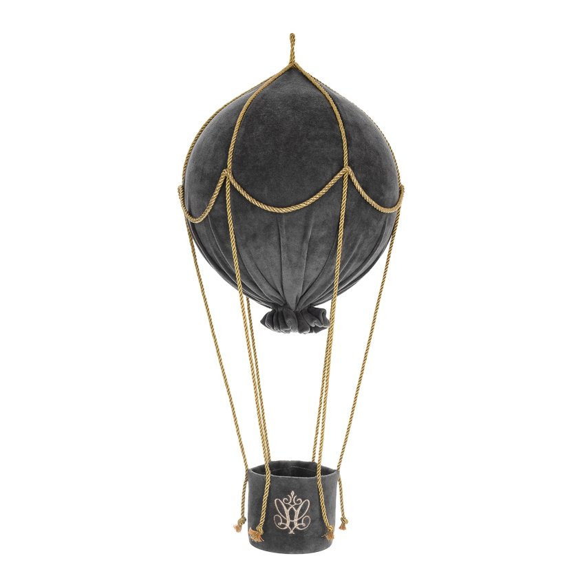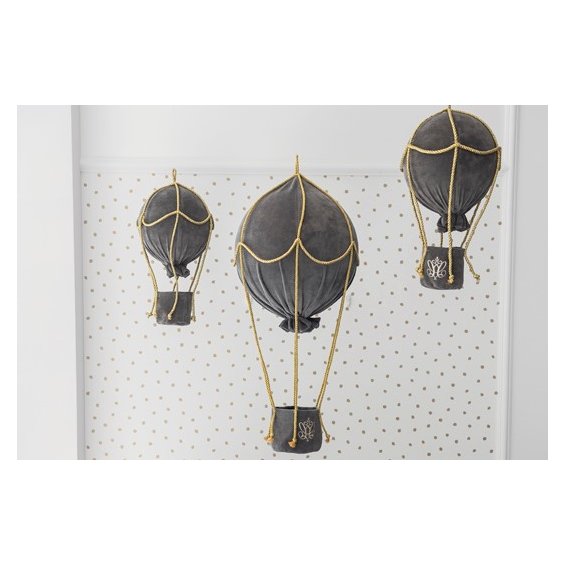 Decorative balloon for a children's room. It's made of anthracite velvet fabric and decorated with an elegant gold emblem. The baloon is equipped with a loop, with which it can be easily hung.