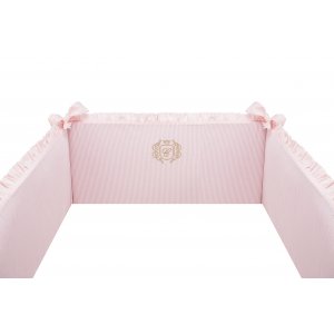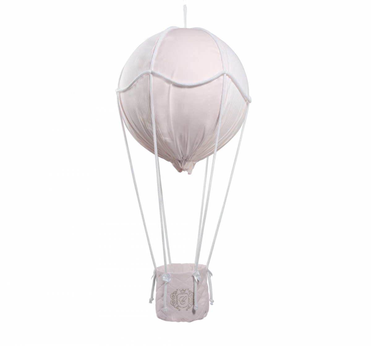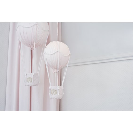 Decorative balloon as a perfect item to a little girl room. Its basket is made of baby pink quilted textile and decorated with an elegant golden emblem. The balloon is made of white-baby pink striped textile. The balloon is equipped with a loop, with which it can be easily hung.