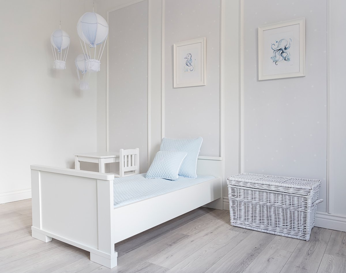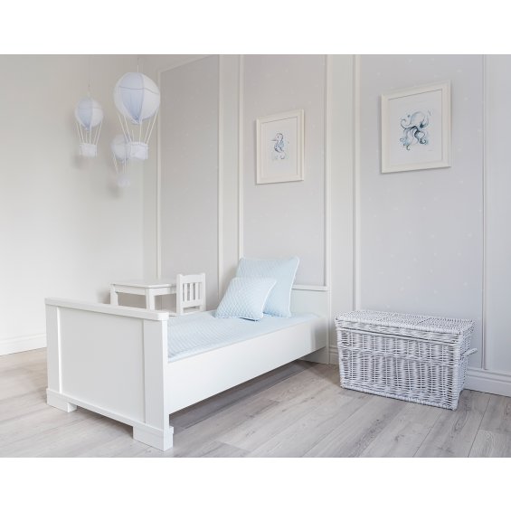 Decorative balloon for a children's room. The basket in the balloon is made of white waffle fabric, while the ball is in white and blue. It is equipped with a loop, with which it can be easily hung.