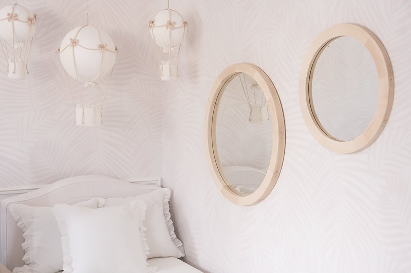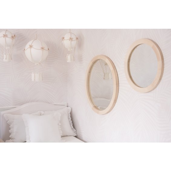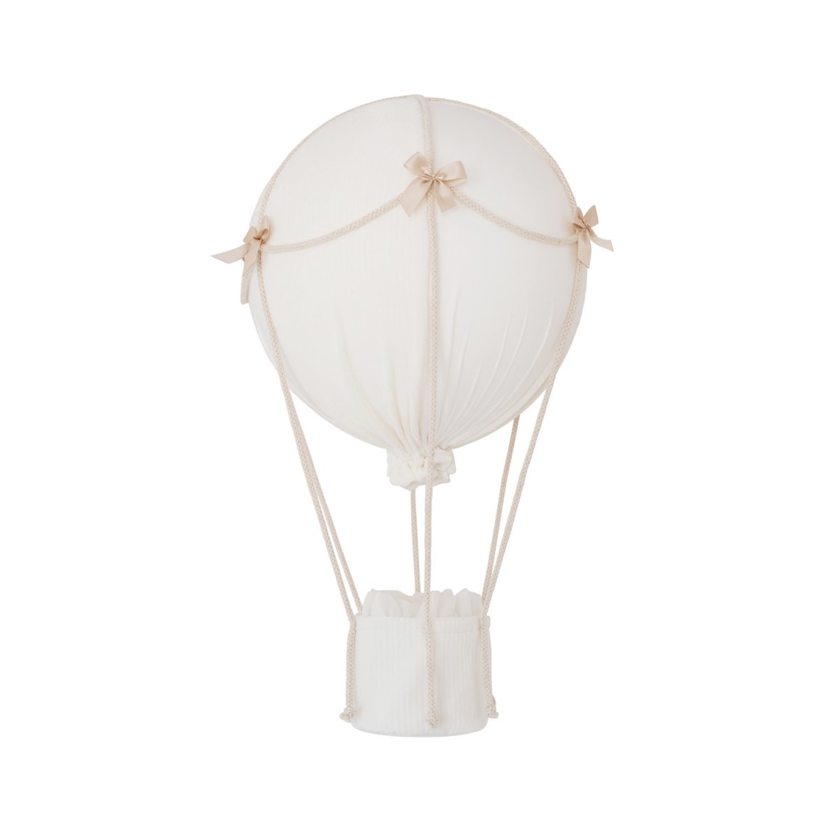 Decorative balloon for a children's room i ivory colour. The balloon is made of velour with various textures - striped and smooth. The basket is decorated with a transparent frill and the strings with lovely beige bows. The balloon is equipped with a loop, with which it can be easily hung.