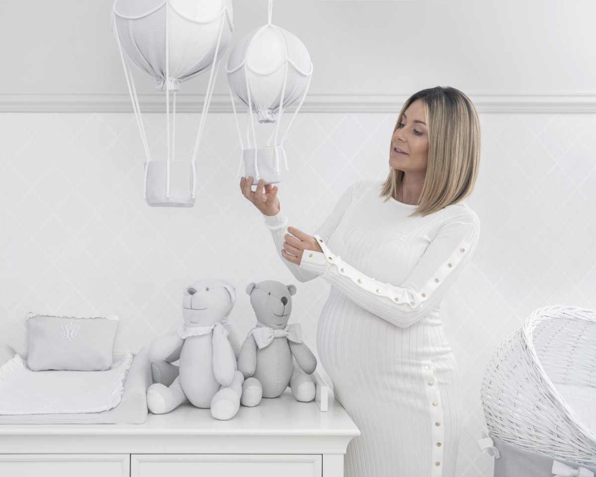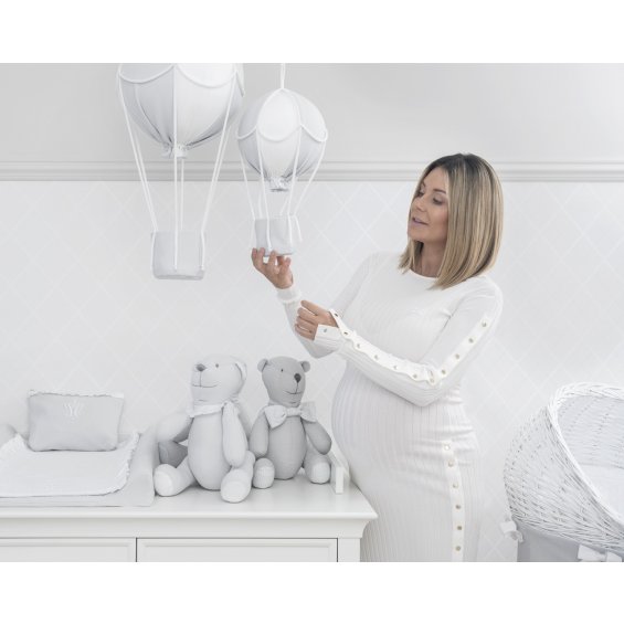 Decorative balloon for a children's room. The basket in the balloon is made of grey waffle fabric. The ball sphere is made of a combination of white and grey waffle fabric. The baloon is equipped with a loop, with which it can be easily hung.