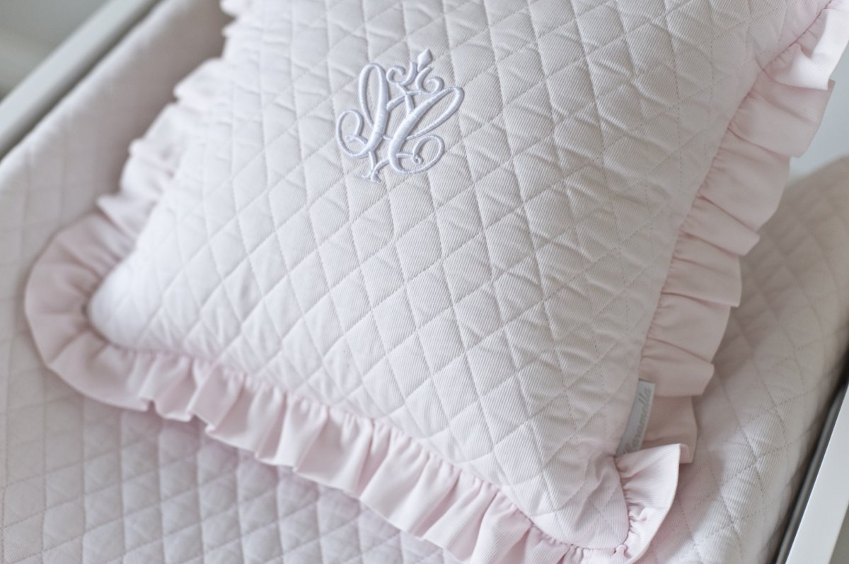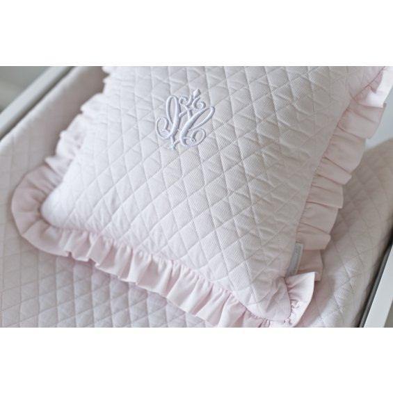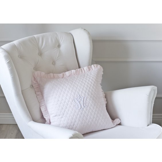 Adorable pillows finished with a decorative frill. Decorated with an elegant three-dimensional emblem in white. Made of high quality quilted fabric. They will be a great decoration in a girl's room.