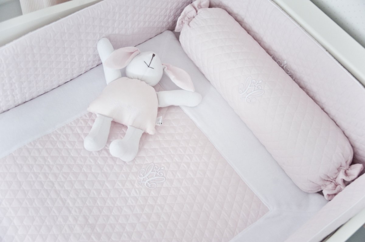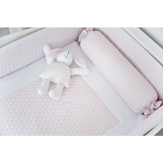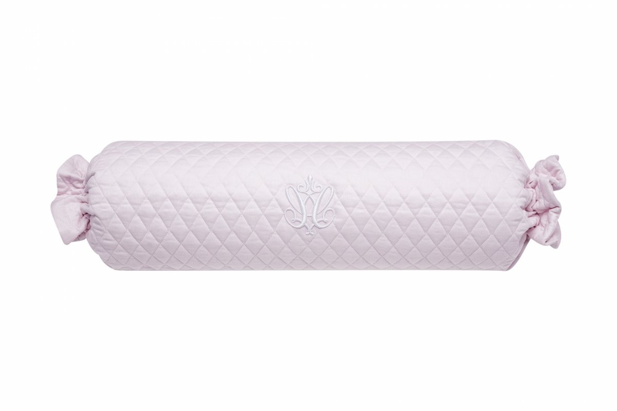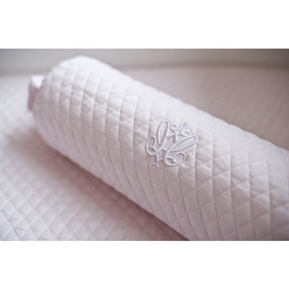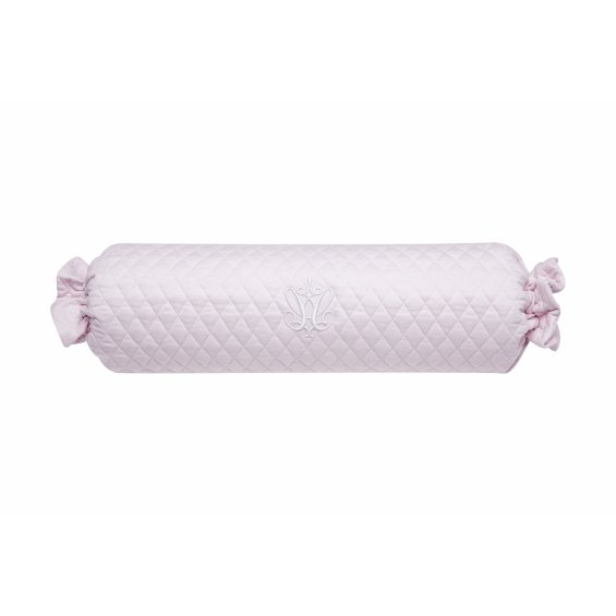 Lovely and stylish baby bolster made of very soft, quilted cotton in baby pink colour. Decorated with elegant embroidery and finished with decorative ties.