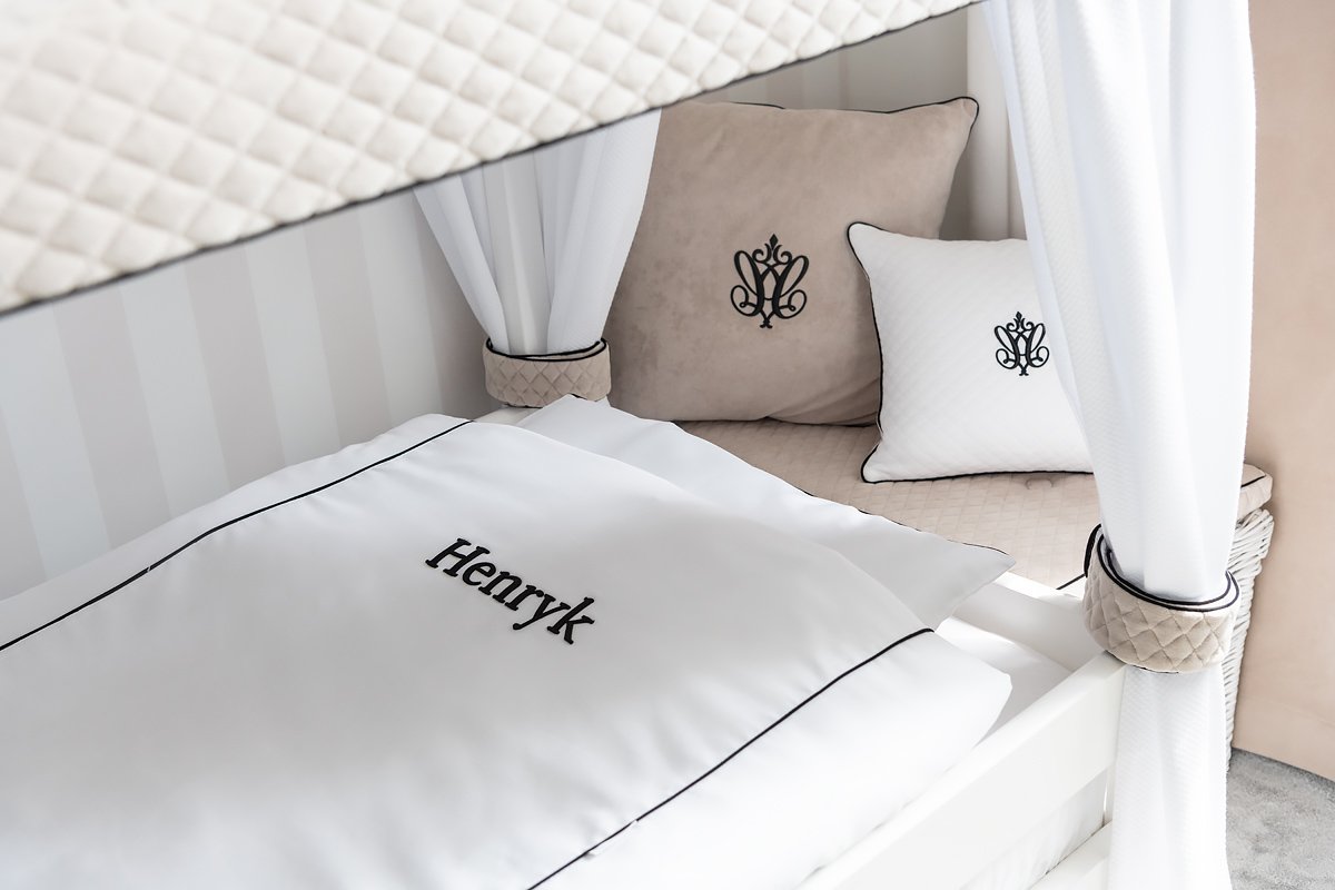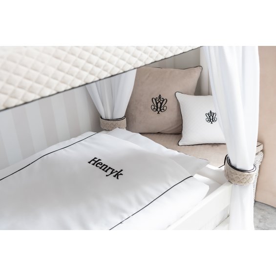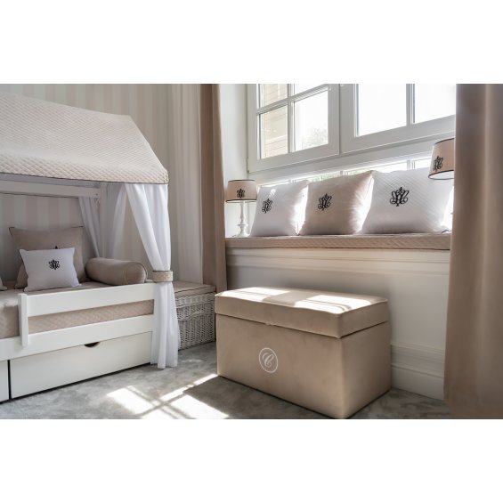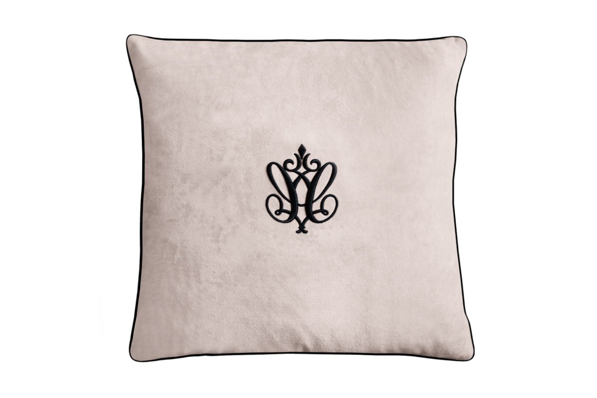 Adorable pillow made of beige velour decorated with a black inset and embroidery.