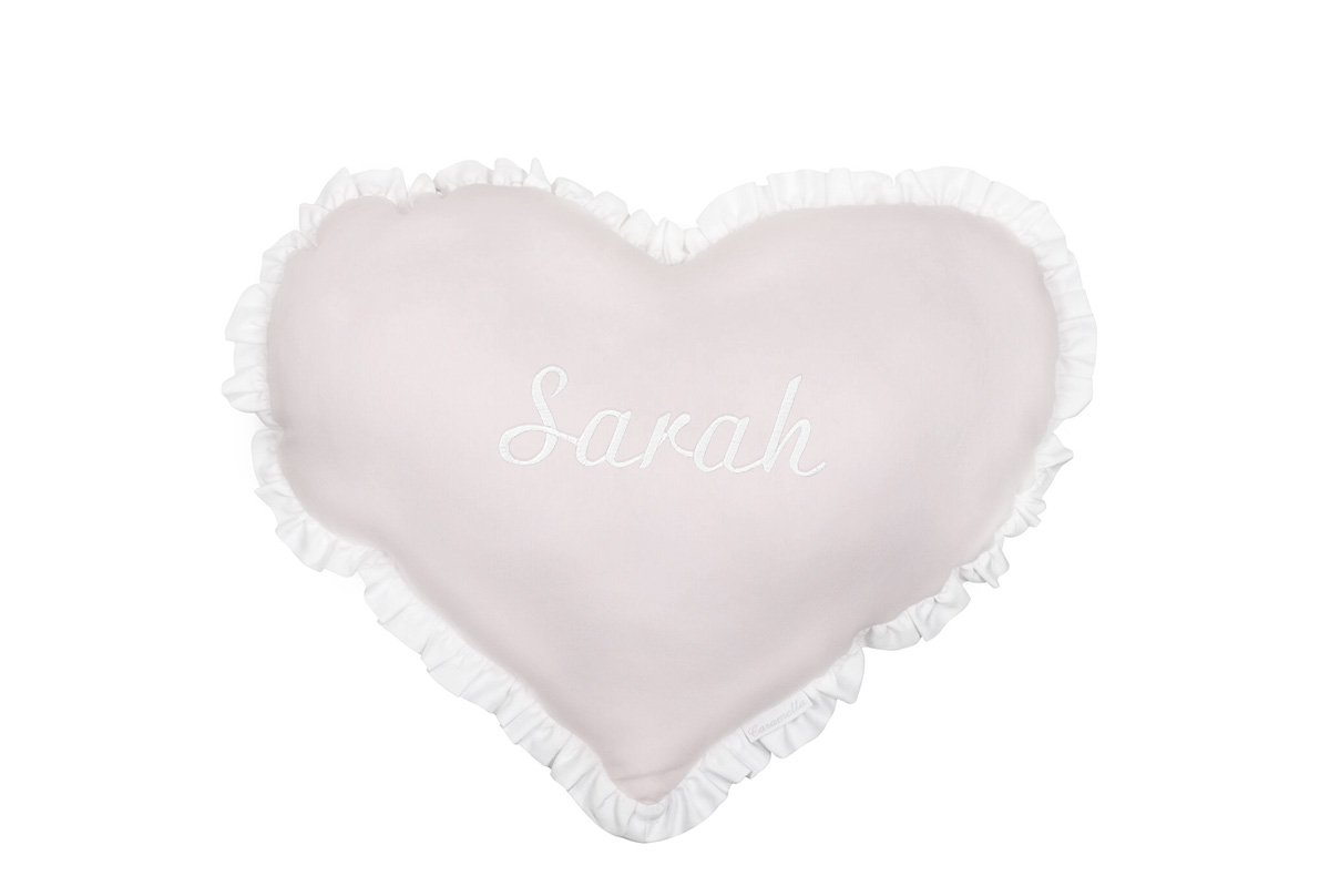 Beautiful heart-shaped pillow with a decorative frill create a unique atmosphere in your child room. The pillow is decorated with elegant embroidery with your child's name and is available in 2 sizes.