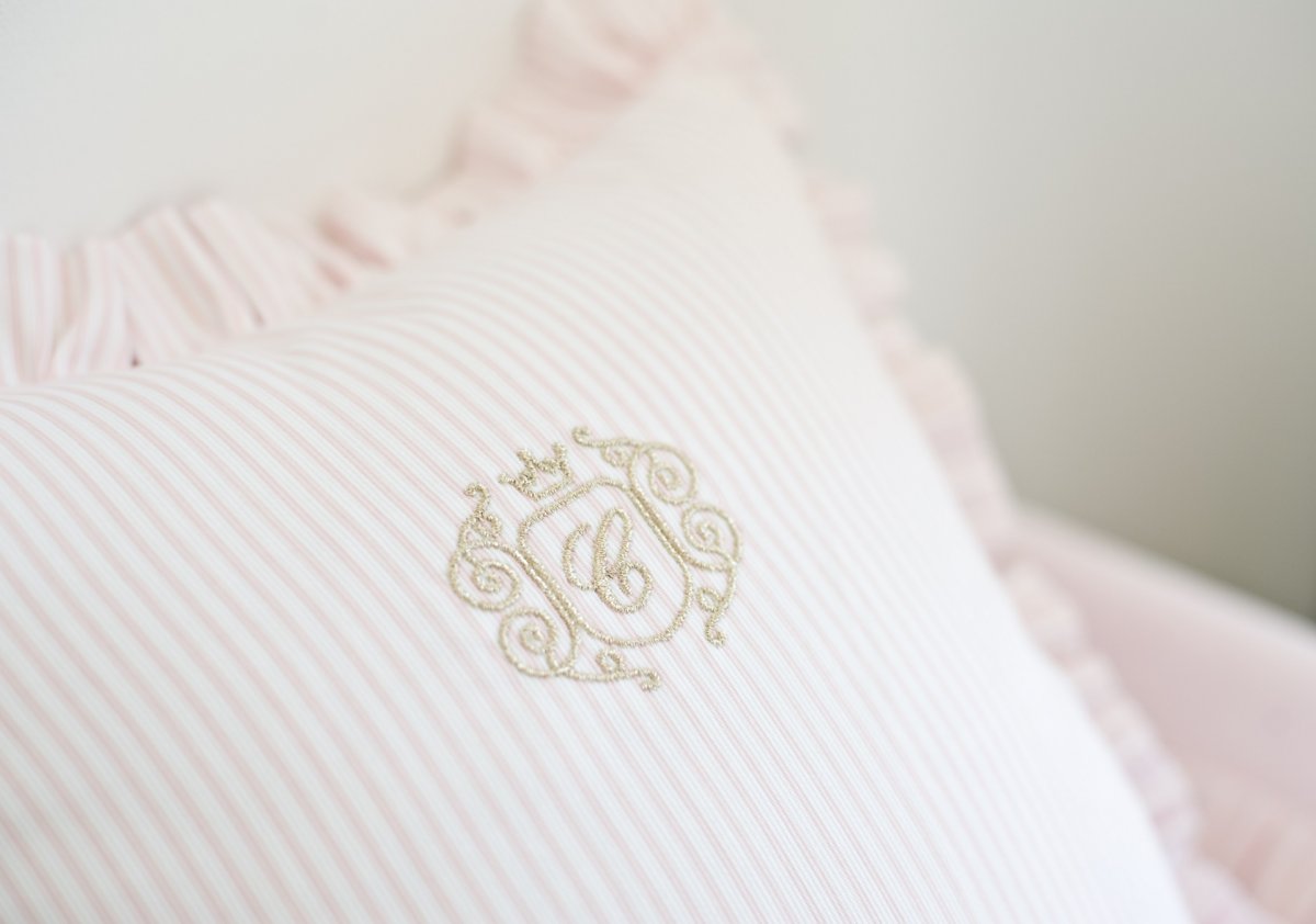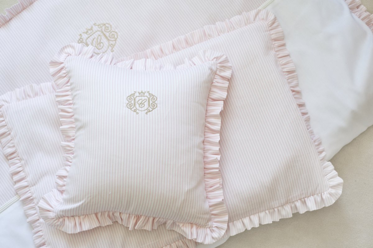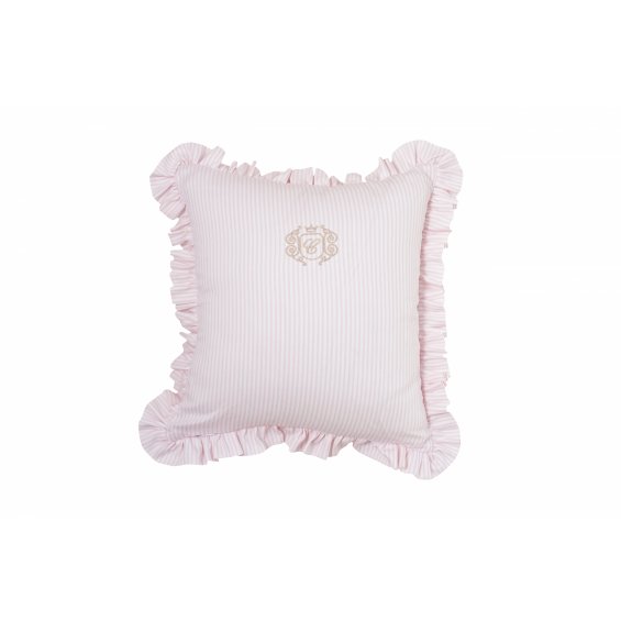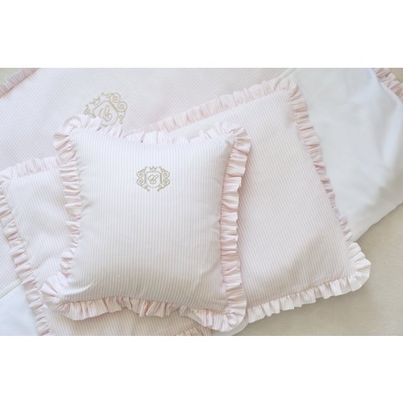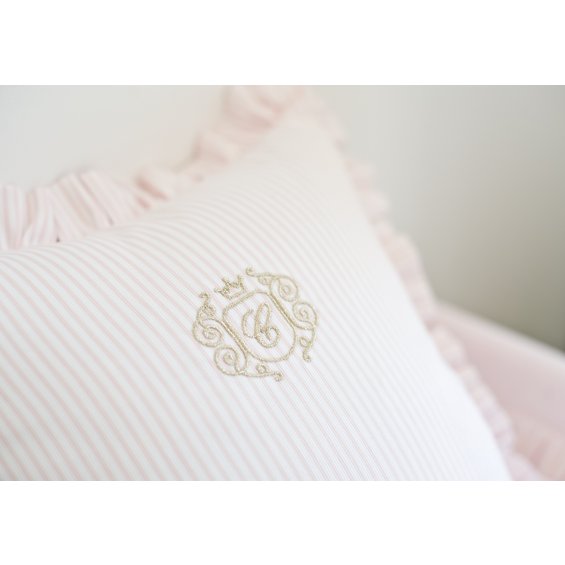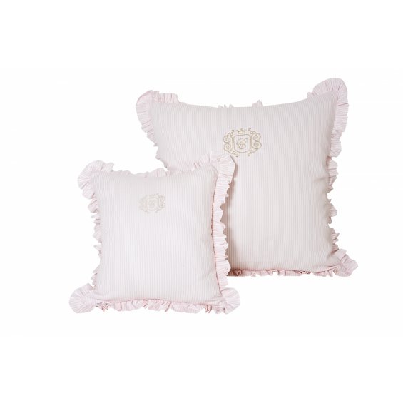 Pink pillows decorated with beautiful flount and elegant gold emblem. Made of high quality cotton with pink-white stripes.
