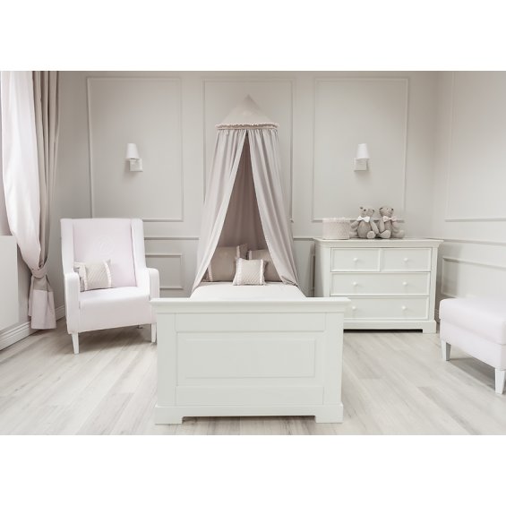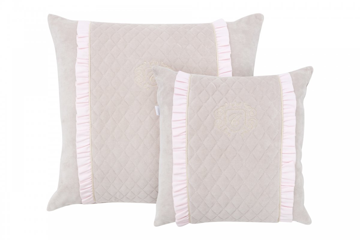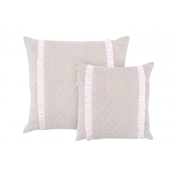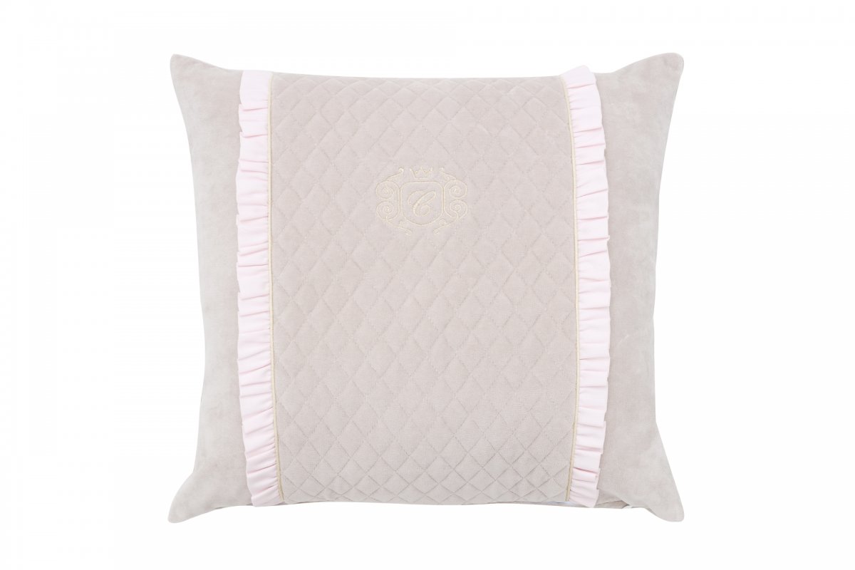 Adorable pillow made of quilted beige velour. It was decorated with an elegant golden emblem and a pink flounce.