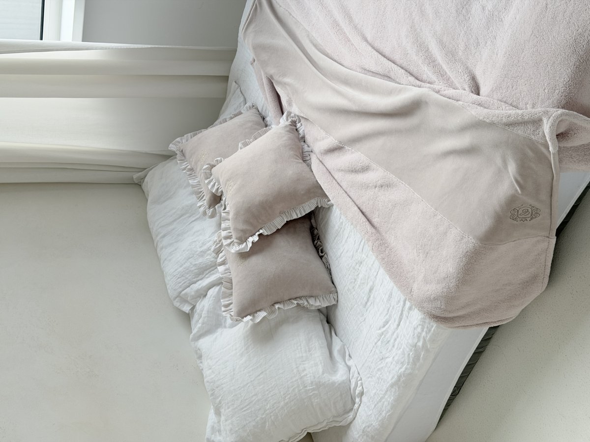 Adorable pillow made of soft beige velour. It was decorated with an elegant golden emblem.