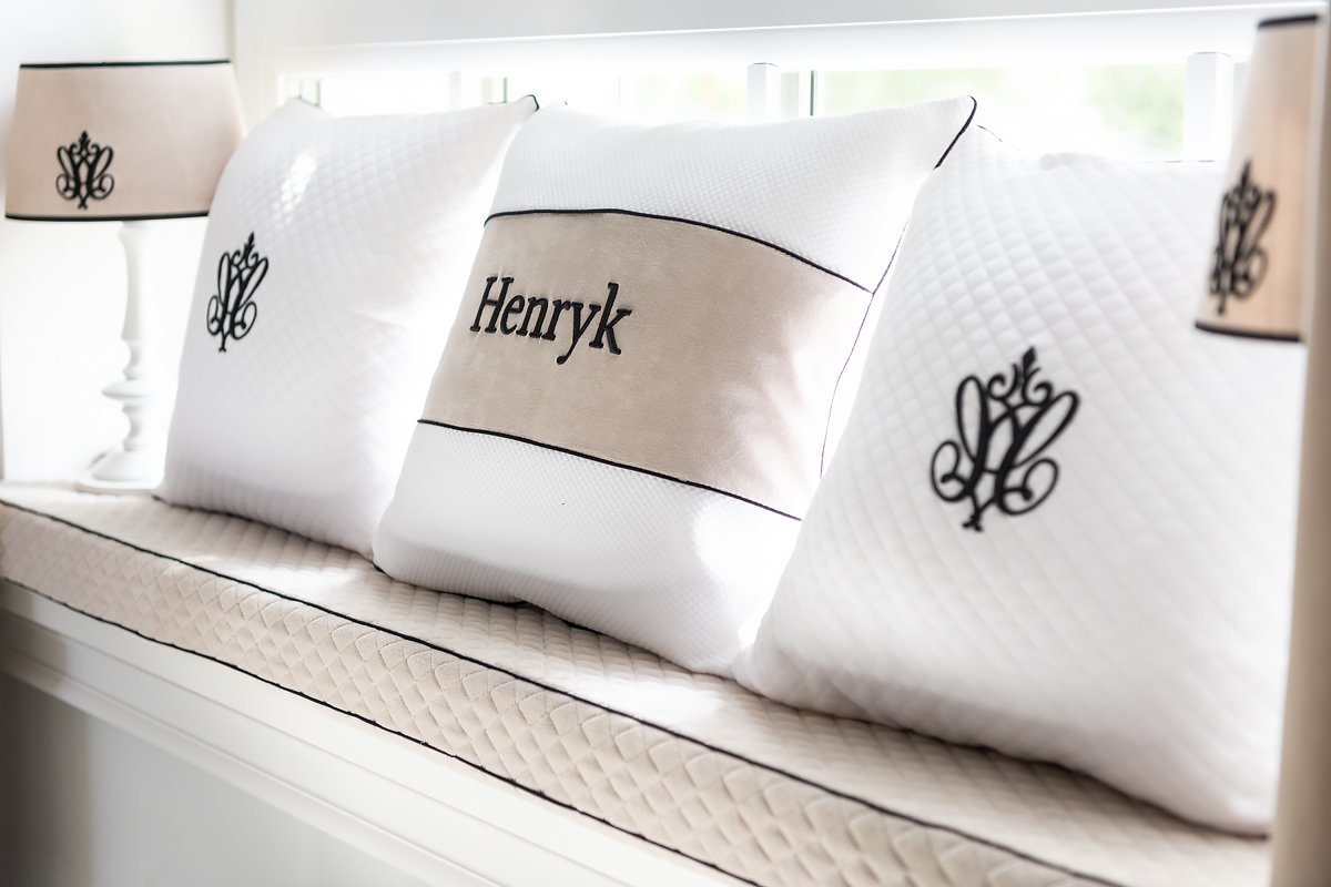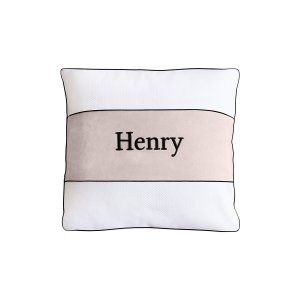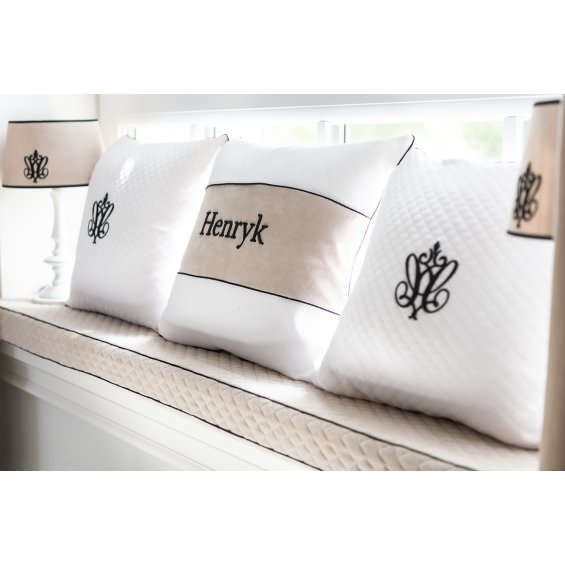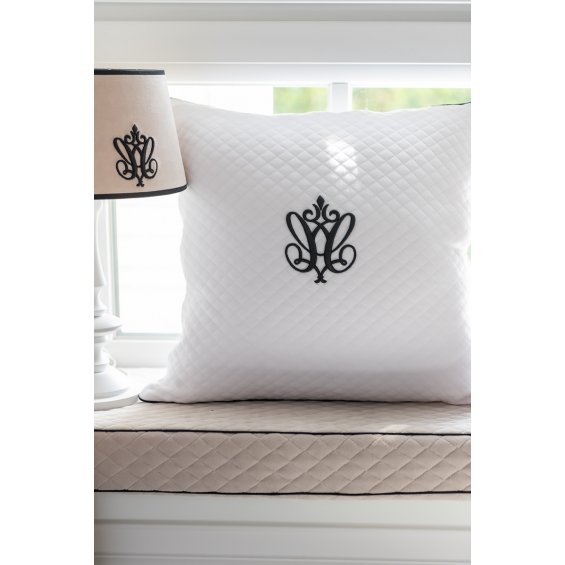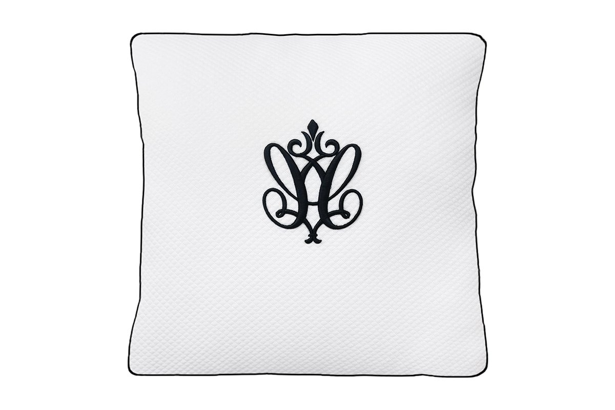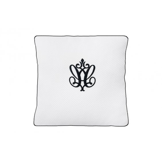 Adorable pillow made of white waffle fabric decorated with a black inset and embroidery.