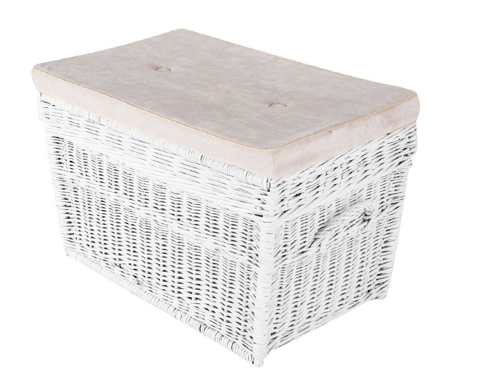 A decorative pillow will change your wicker trunk into a comfortable place to sit or to play. It is made of high quality beige velour fabric and decorated with an elegant golden emblem.