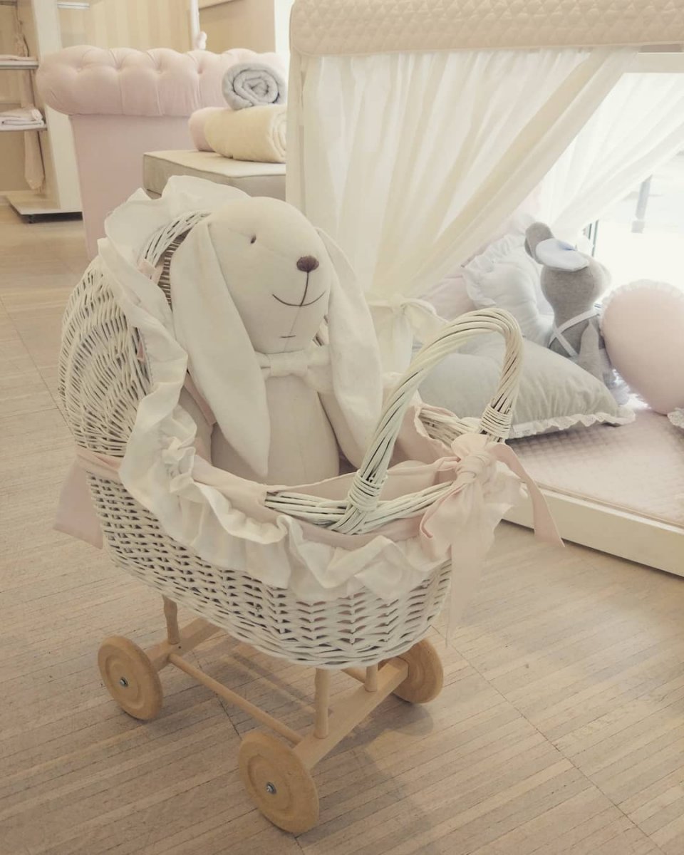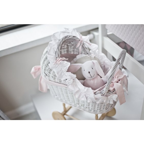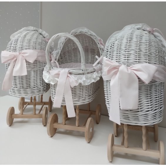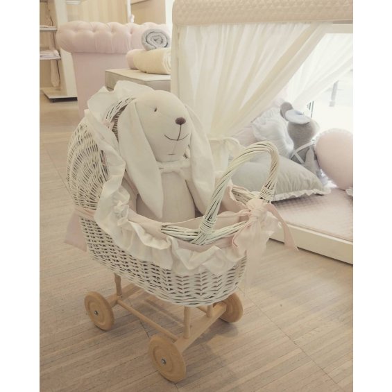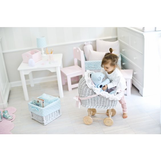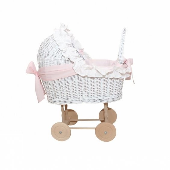 A beautiful wicker trolley with white and baby pink elements. It is handmade of the best quality Polish wicker, lacquered white and decorated with white cotton frill and a baby pink inner part. It will be a perfect decoration, or an attractive toy for your child.