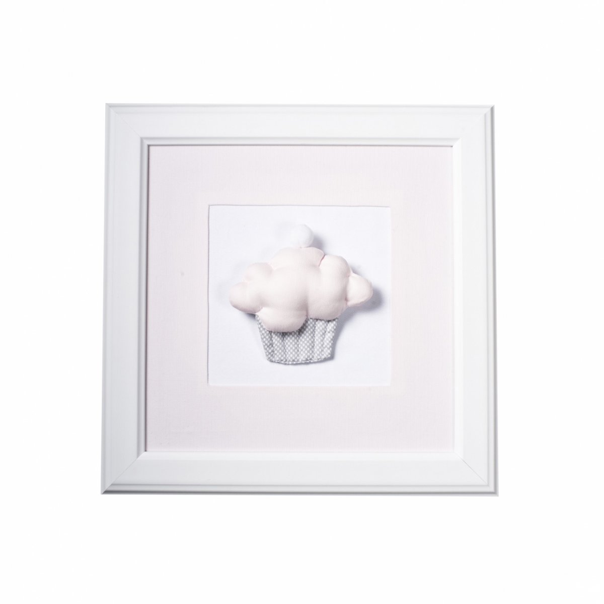 Adorable three-dimensional muffin in baby pink and grey colours. The inner part of the picture is made of textile. Passe-partout is made of grey cube textile.