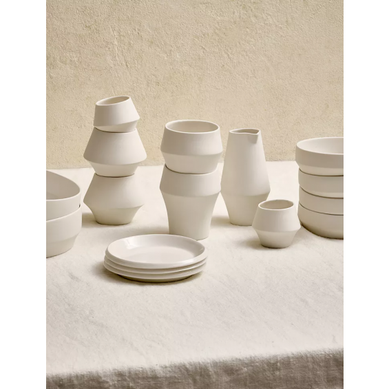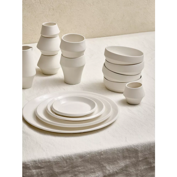 Kojin, named after the Japanese ‘Kami’, the spirit of fire, kitchen and transformation, captures a quiet strength and poetic simplicity. Crafted in pure white porcelain, each piece balances rawness and refinement, with a matte outer skin and a glossy, light-catching interior. A delicate fracture line flows through the design like a whisper, echoing the feminine form in soft, curved silhouettes. Minimal yet expressive, Kojin brings a sense of ritual to the everyday.