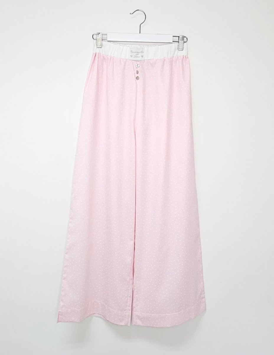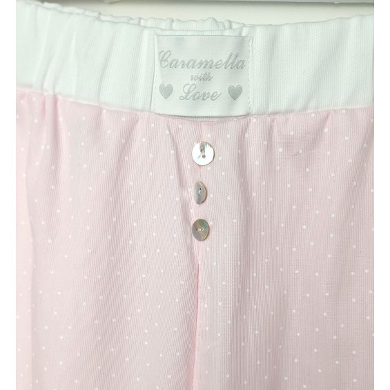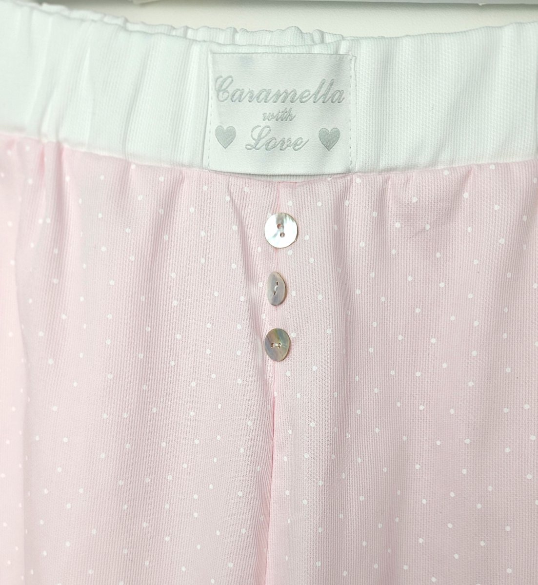 Cotton pajama pants in powder pink with white polka dots – a perfect blend of comfort and style. Made from soft, breathable cotton, they provide full freedom of movement and a pleasant touch against the skin. Light and comfortable, they are ideal for sleeping, morning relaxation, or calm evenings at home. The classic polka dot pattern adds elegance and a timeless charm.