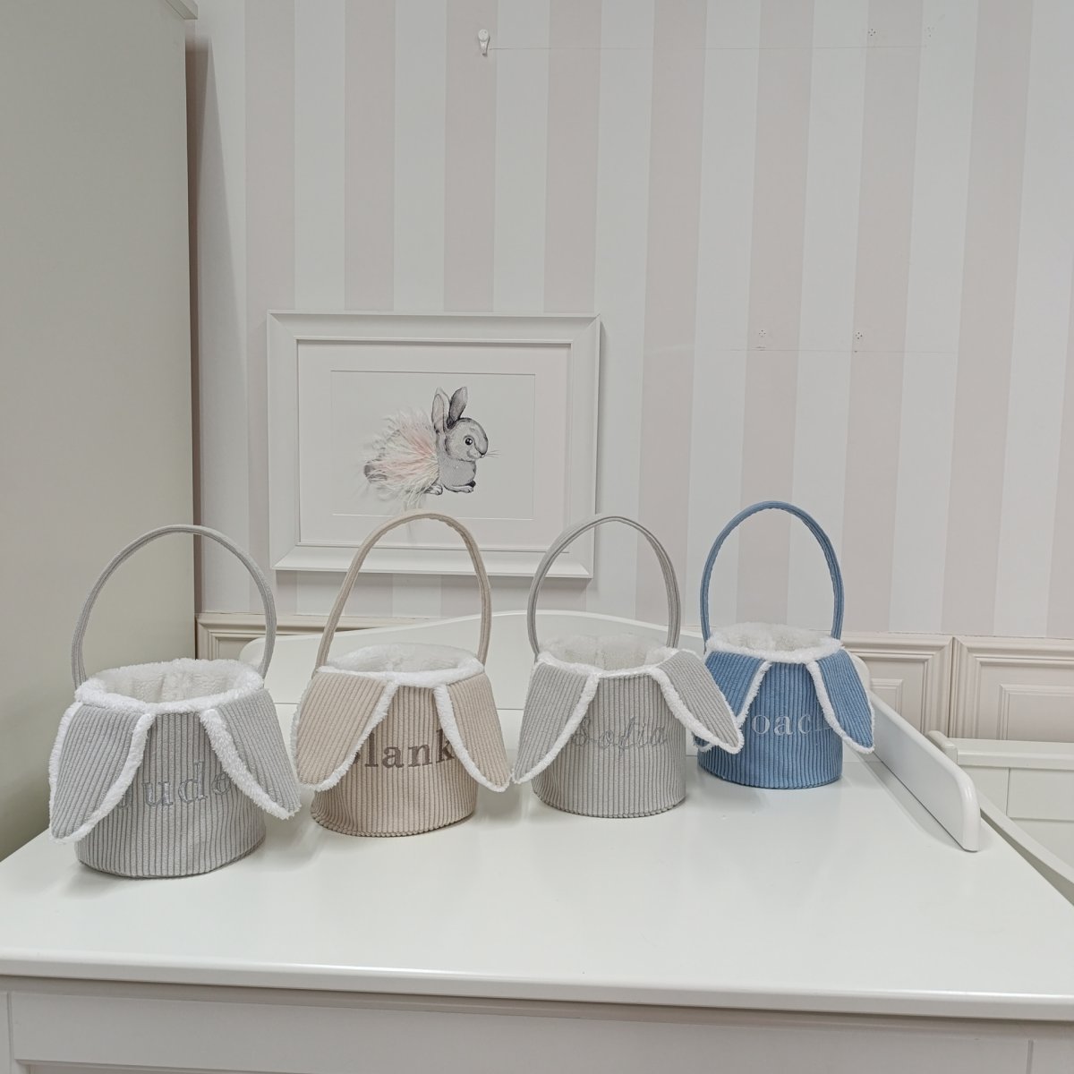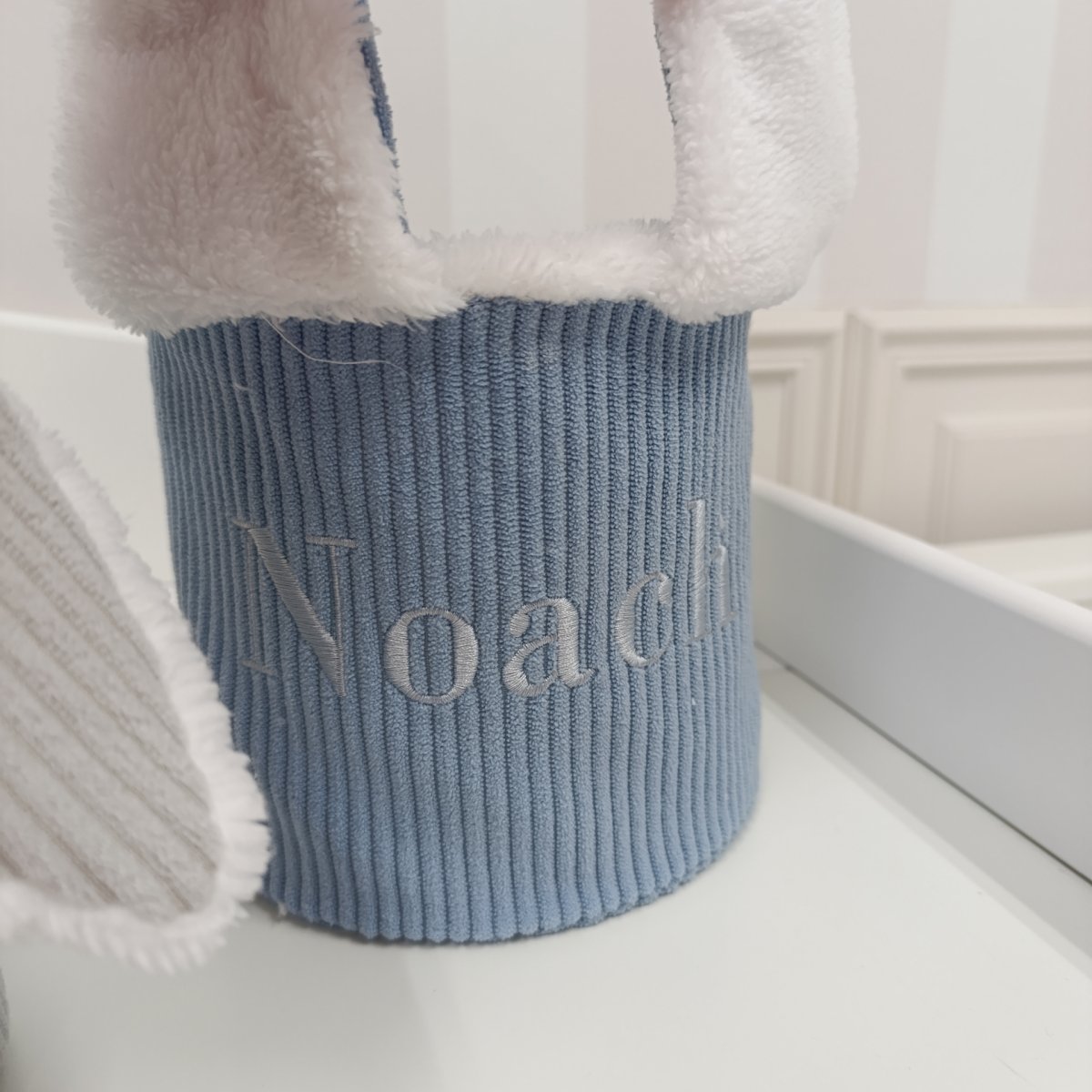 It is made of stiffened blue corduroy lined with soft fur. It is decorated with charming bunny ears and embroidery with the child's name.
