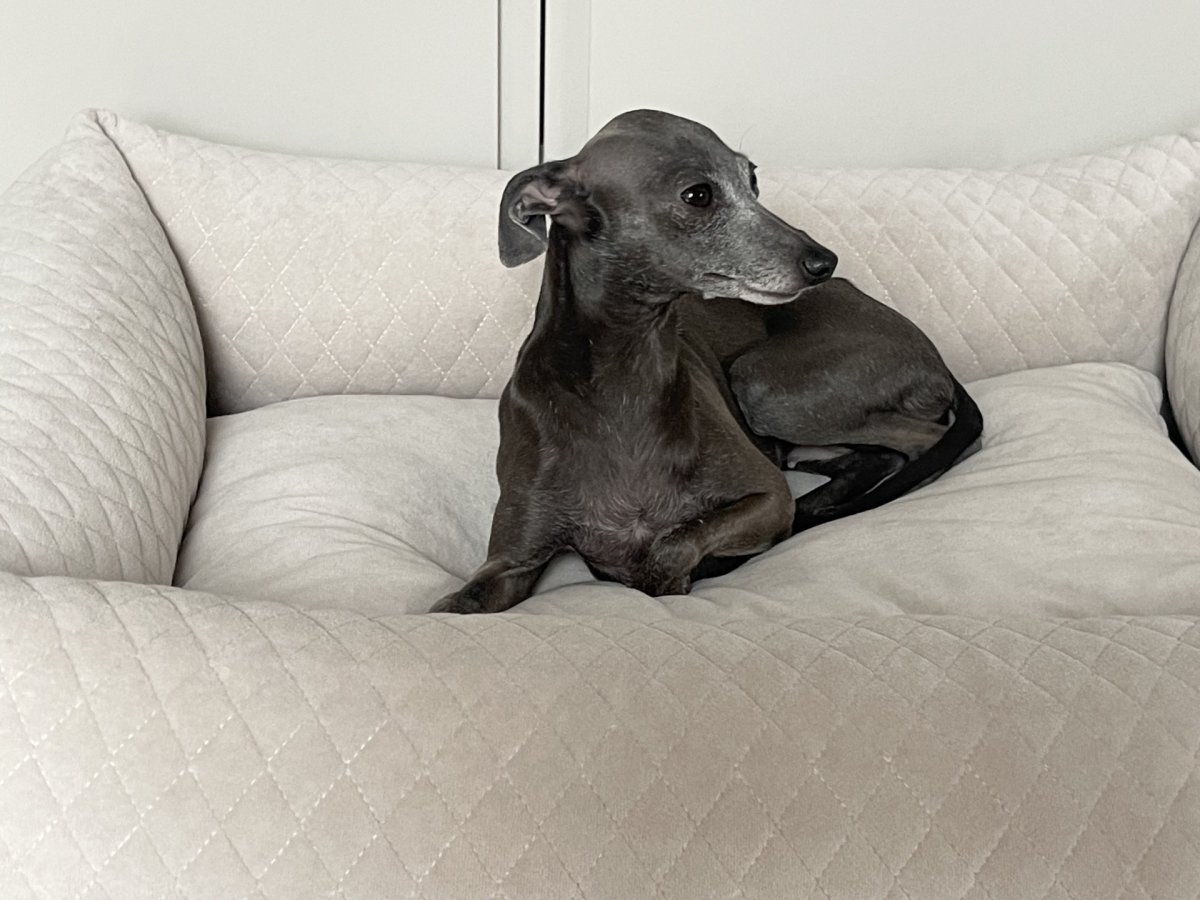 This modern and simple in form dog bed will perfectly fit into the style of your interior. Extremely comfortable for the dog and very practical to use. Equipped with a soft pillow in the middle and 4 side pillows. The removable cover is machine washable. The bed is available in 3 sizes.