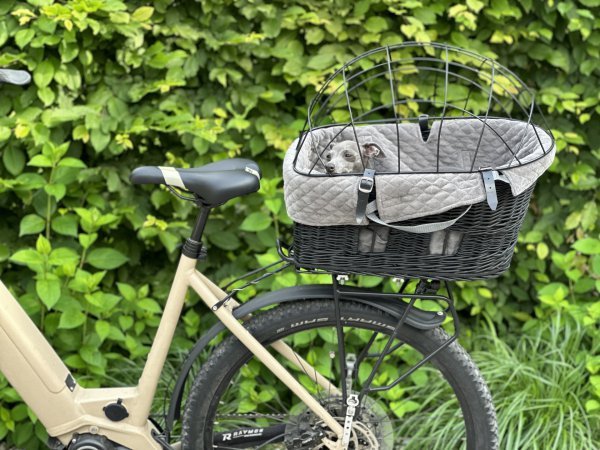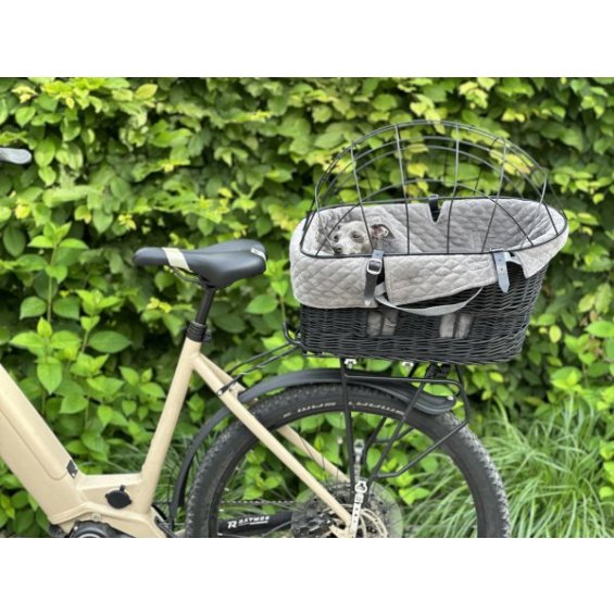 Very stylish and functional bicycle basket for transporting animals mounted on the trunk. Equipped with a solid mounting bracket, safety grille, a cover and a soft cushion. The cover with a cushion ensures the comfort of traveling. For greater safety, a short leash with a carabiner has been attached inside, to which you can attach a dog's collar. The mounting bracket is adjustable, thanks to which the basket fits into any trunk. Its knob allows for quick assembly and disassembly of the basket. Grille mounted with three leather straps. You can easily dismantle it at any time and transport your pet fastened with a leash. The basket is designed for animals up to 15 kg.