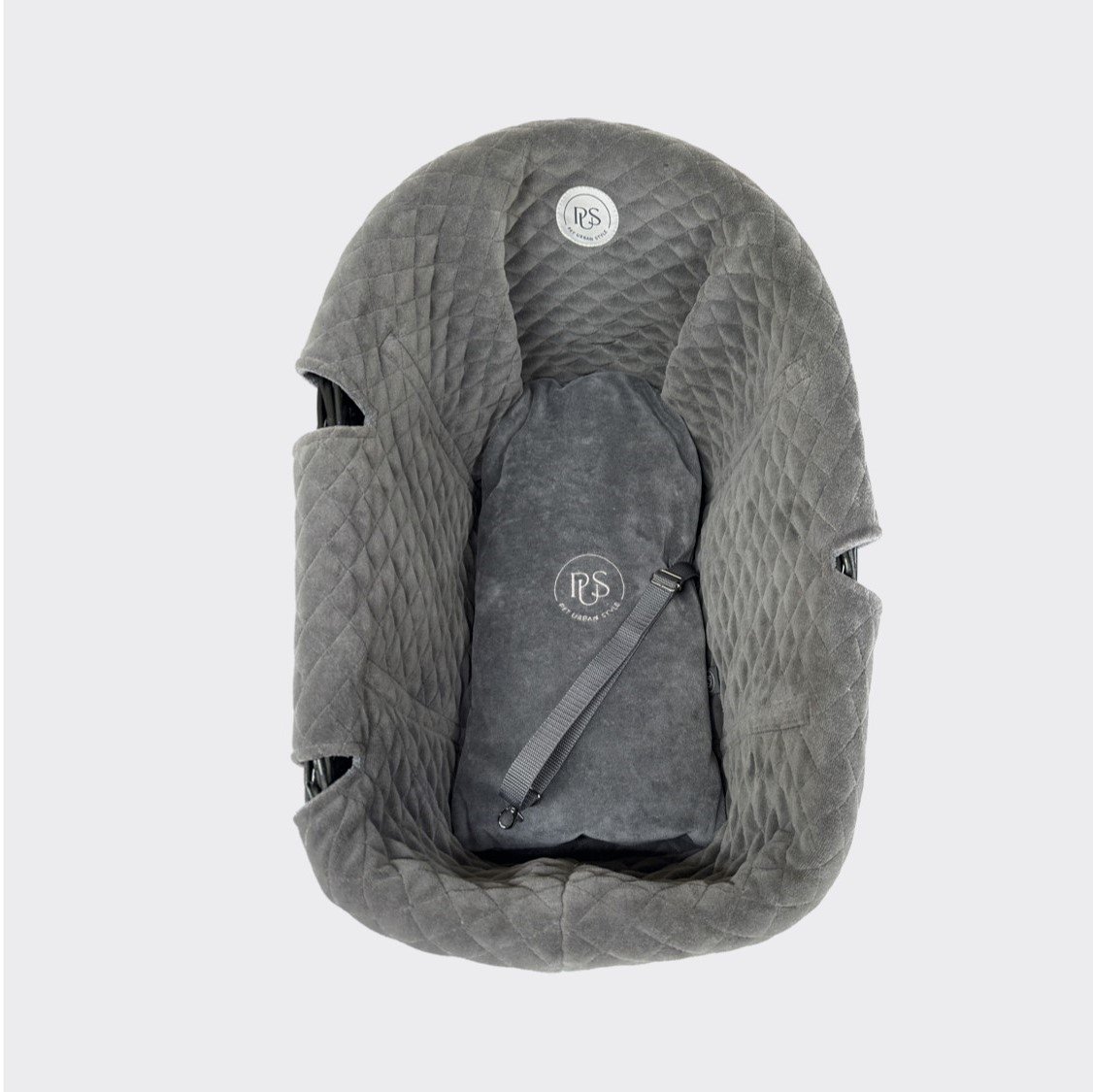 MATERIALS: basket - varnished wicker and pine wood; grille - metal; straps - eco leather; cover - velour (80% cotton, 20% polyester); filling - polyester fibers. Velour is a pile fabric on which the embroidery process can leave a hoop mark that should diminish over time