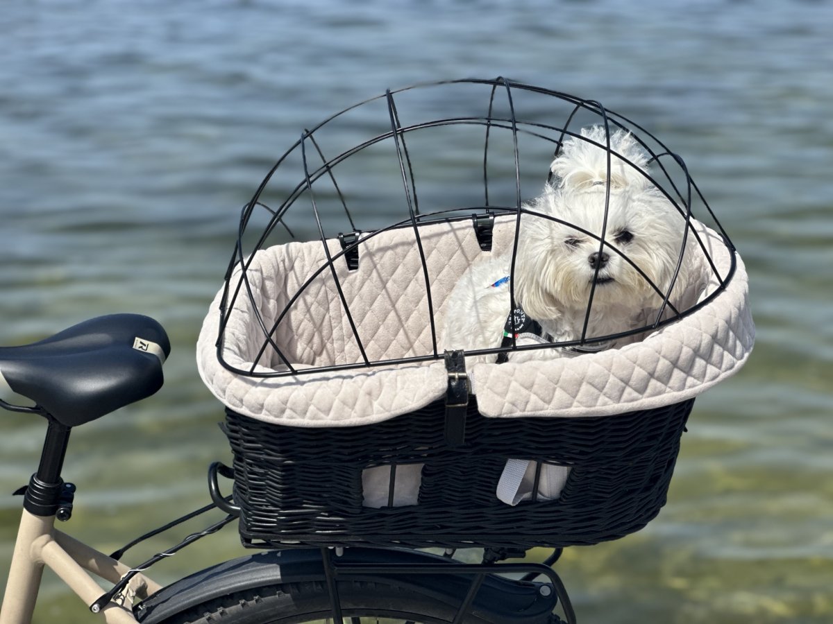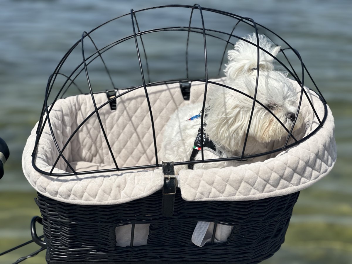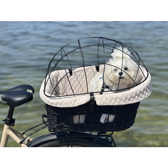 Very stylish and functional bicycle basket for transporting animals mounted on the trunk. Equipped with a solid mounting bracket, safety grille, a cover and a soft cushion. The cover with a cushion ensures the comfort of traveling. For greater safety, a short leash with a carabiner has been attached inside, to which you can attach a dog's collar. The mounting bracket is adjustable, thanks to which the basket fits into any trunk. Its knob allows for quick assembly and disassembly of the basket. Grille mounted with three leather straps. You can easily dismantle it at any time and transport your pet fastened with a leash. The basket is designed for animals up to 15 kg.